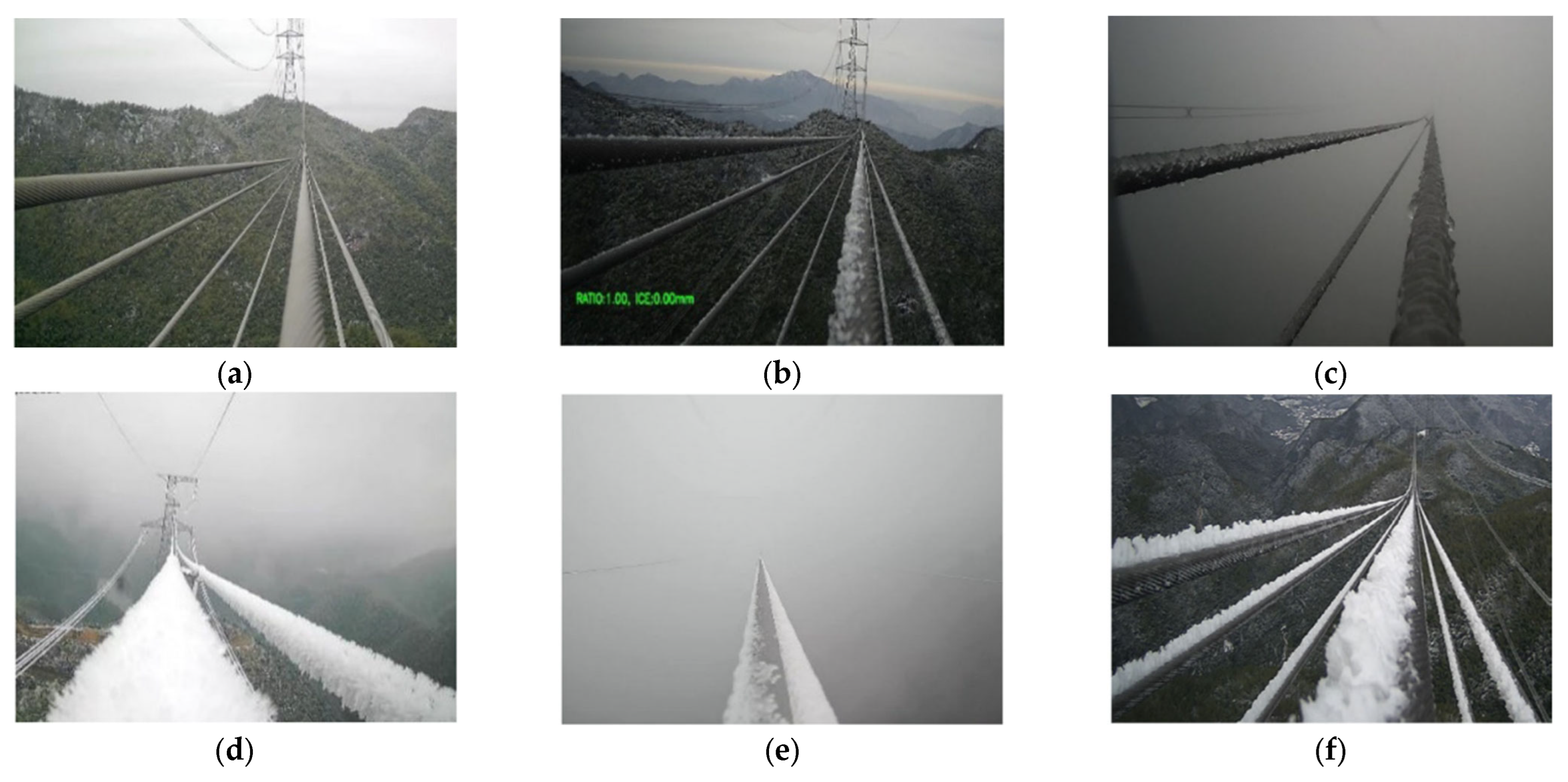 Against the backdrop of global warming, the Earth has entered a 30-year period of regional cooling within a 300-year cycle. The interplay between warm and cold climates has intensified extreme weather phenomena: while overall temperatures rise, the frequency and intensity of disasters such as cold waves and blizzards have increased significantly, leading to amplified destructive impacts [1]. Transmission line icing is a widespread natural phenomenon across the globe, particularly in cold and humid climates. Icing disasters pose a major challenge to power systems worldwide. Ice accumulation not only seriously threatens the safe operation of transmission lines, but can also trigger a chain of accidents, including wire breaks, tower collapses, flashover and collapse of insulators, and conductor galloping [2,3]. Countries such as Russia, Canada, the United States, the United Kingdom, and Norway have all experienced severe icing events, resulting in substantial economic losses [4,5,6]. Russia, as the country with the largest high-latitude territory in the world, faces severe adverse icing conditions on its power grid annually. Consequently, Russian scholars have conducted a considerable number of fundamental and applied research studies on ice accretion [7,8,9]. In China, due to its complex terrain and diverse climate, transmission line icing is especially prominent. During the winter of 2018–2019, Jiangxi Province experienced persistent freezing rain disasters, leading to severe icing accidents in the transmission system. The event caused over 30 protective trippings on dozens of 110 kV and higher-voltage transmission lines across the province, including 44 wire breaks and 7 structural collapses of transmission towers, significantly impacting regional power supply stability and socio-economic activities [10]. Therefore, in-depth research on the formation mechanisms, detection technologies, and prevention measures of transmission line icing is of great importance for ensuring the stable operation of power systems.