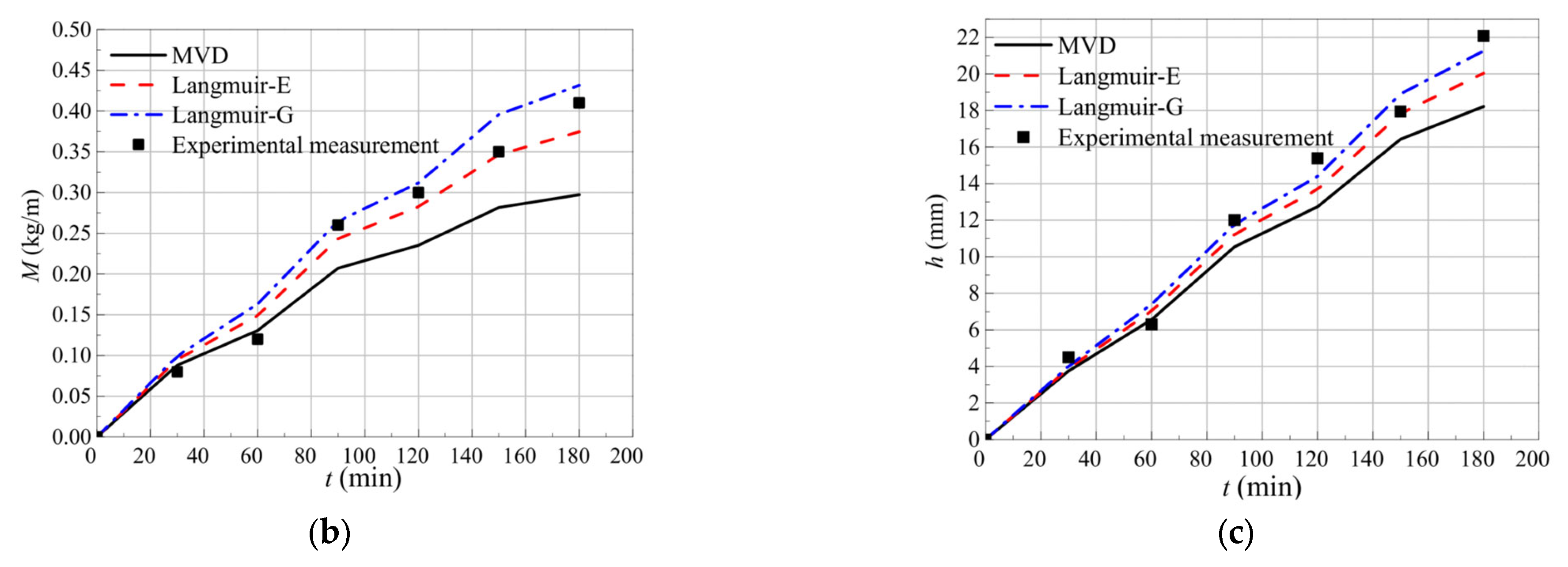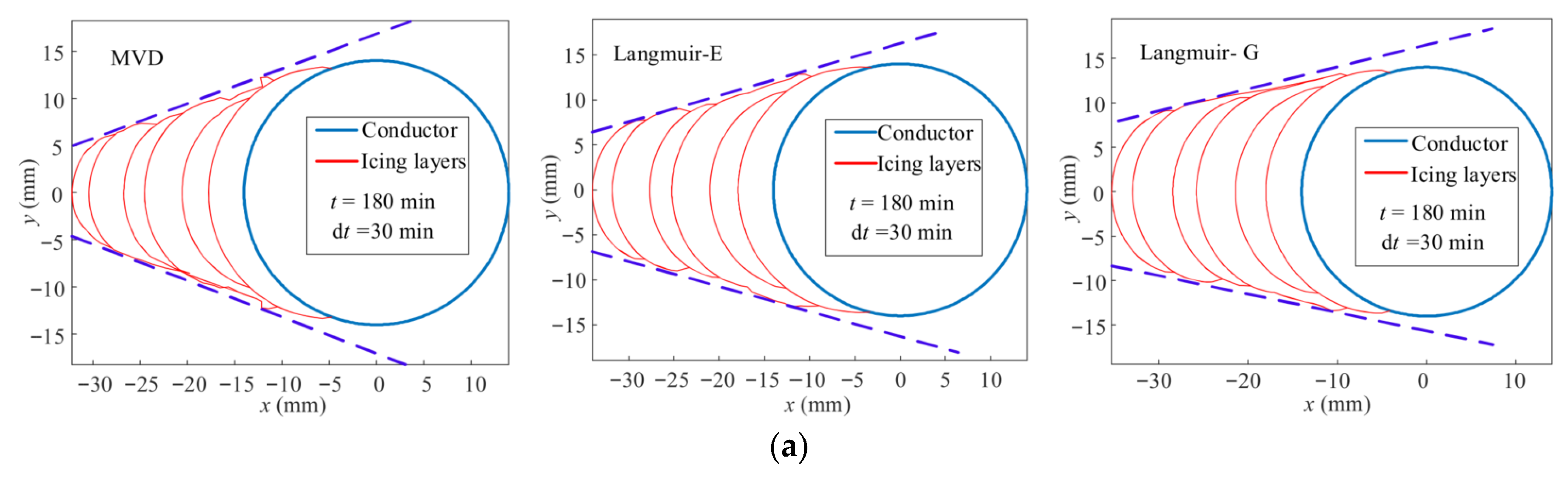Wind speed and raindrop size collectively determine the aerodynamic behavior and collision efficiency of water droplets, serving as coupled variables that cannot be neglected in icing prediction models. An increase in wind speed enhances the relative velocity between raindrops and the conductor, thereby raising the collision kinetic energy and collision efficiency. However, when wind speed becomes excessively high, smaller droplets may be deflected by airflow around the conductor, reducing collision efficiency. Large droplets (e.g., diameter > 500 μm) possess high inertia, making their trajectories less susceptible to airflow disturbance and thus more likely to collide with the conductor. In contrast, small droplets (e.g., diameter < 100 μm) tend to follow the streamlines, resulting in low collision efficiency. Medium-sized droplets (200–400 μm) under moderate wind speeds (3–15 m/s) achieve an optimal balance between collision and capture, making them most conducive to stable ice accretion [20]. The collision coefficient, a key parameter describing droplet capture capability, is often determined using the Langmuir-Blodgett model or numerical simulations such as CFD. For instance, Wang et al. [21] and Xu et al. [22] utilized software to simulate two-phase flow and thermal equilibrium around conductors, providing detailed analyses of the influence of multiple parameters including wind speed, MVD, and liquid water content. Han et al. [23] highlighted that ignoring the droplet size distribution and relying solely on MVD may lead to prediction errors in ice growth rate ranging from 14% to 300%. The conductor icing calculated based on environmental parameters measured in the tests, including icing shapes, icing mass, and icing thickness, is illustrated in Figure 3.
