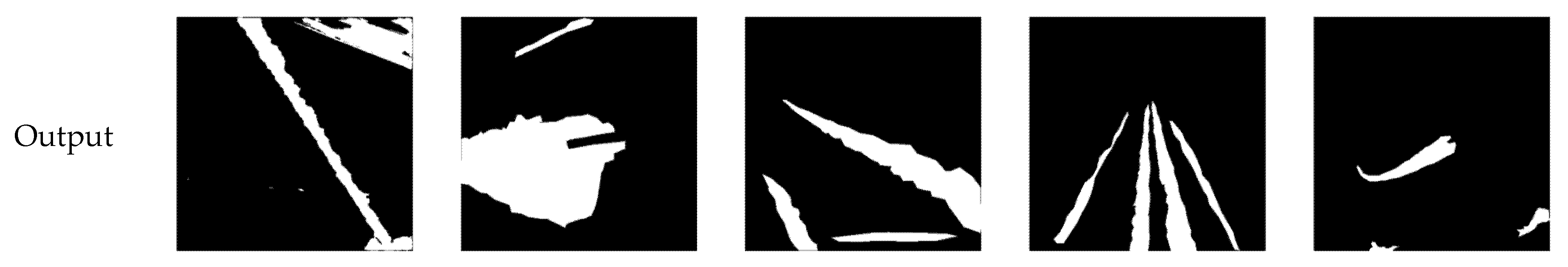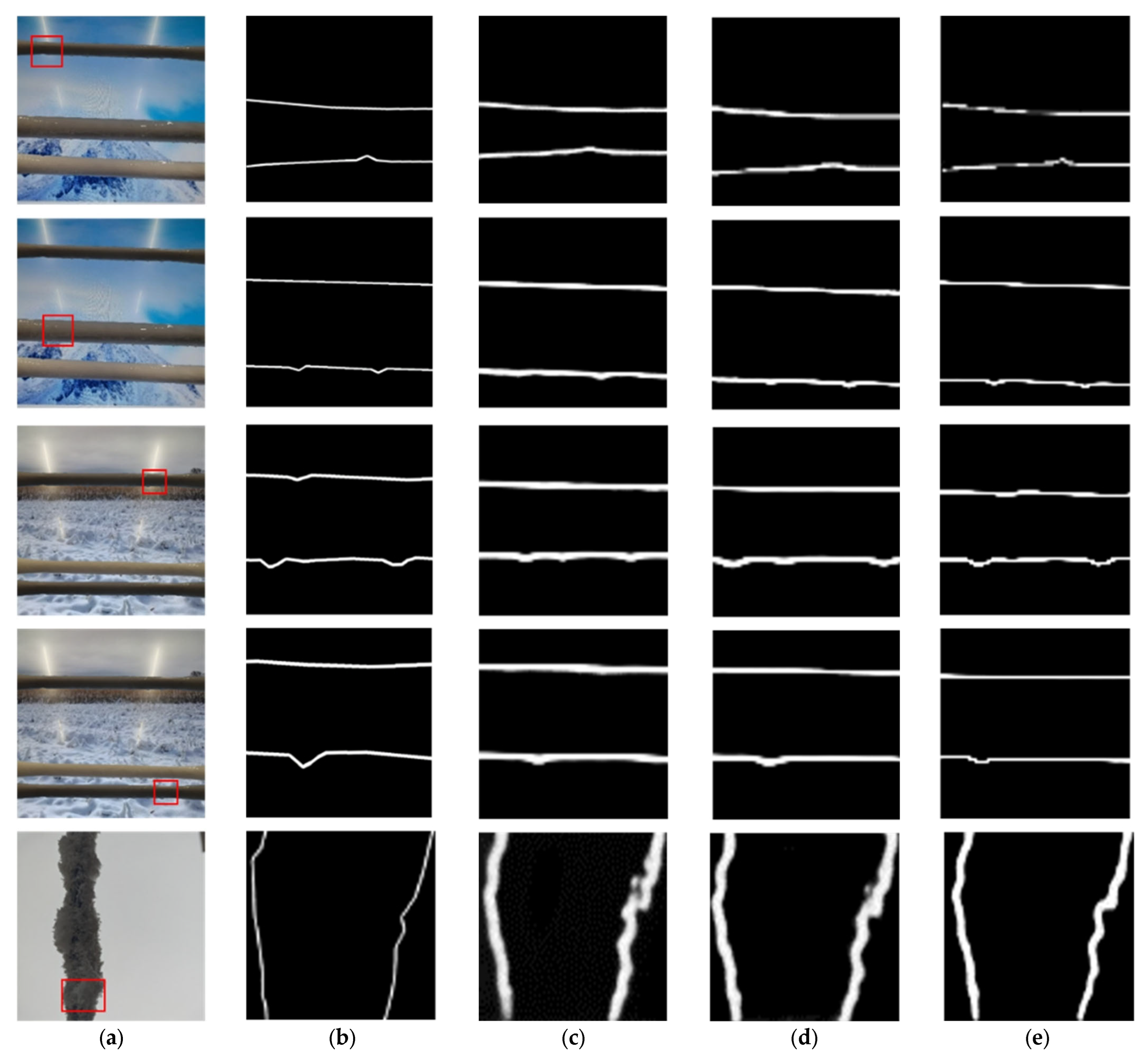 In recent years, deep learning models have achieved remarkable progress in the field of transmission line icing detection. Zhou et al. [59] applied a GPR model to process micro-meteorological data, achieving high accuracy, though its applicability remains limited under single working conditions. Li et al. [60] proposed a hybrid CNN-RF model that combines the feature extraction capability of convolutional neural networks with the classification strength of random forests, further improving recognition performance. Ma et al. [61] innovatively integrated the advantages of ResNet and FPN to construct a multi-scale feature fusion model, which effectively combines shallow detailed features with deep semantic information and significantly enhances the accuracy of icing identification. Yang et al. [62] utilized IULBP texture features, providing a new approach for the recognition of ice types. Yue et al. [63] achieved classification of ice and non-ice images using a multilayer perceptron neural network. Hu et al. [64] proposed an SGAN-UNet network that combines generative adversarial networks with S-UNet, markedly improving segmentation performance. Dong et al. [65] introduced the LDKA-Net algorithm, which enhances feature extraction capability through WFVC-Net and an EM-DCA mechanism, substantially improving detection accuracy while reducing the number of model parameters. Zhang et al. [66] proposed a novel CG-UNet deep learning model that excels in detecting non-uniform icing regions. This model adopts an encoder–decoder architecture and innovatively incorporates a CGM, enabling effective utilization of encoder features to distinguish easily confusable pixels during edge generation. A comparison of detection results is shown in Figure 5.
