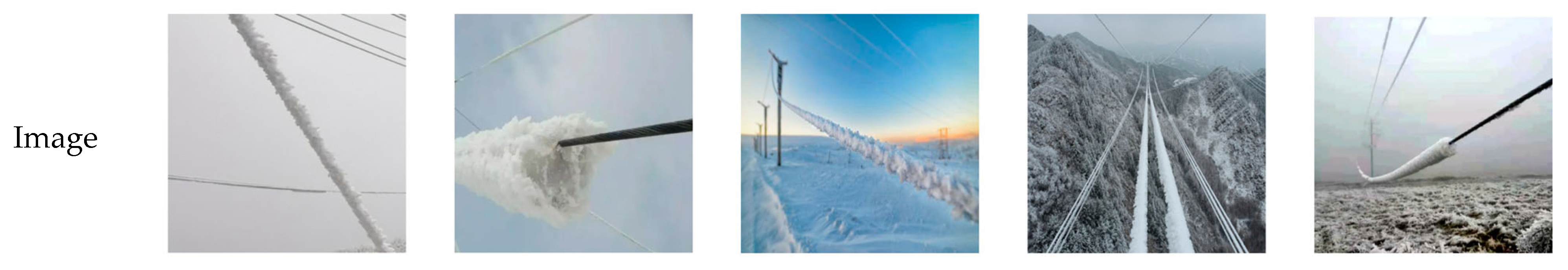 The icing on transmission lines can be classified into five types [13]: wet snow, hoar frost, rime, mixed rime, and glaze. The typical morphologies are illustrated in Figure 2.