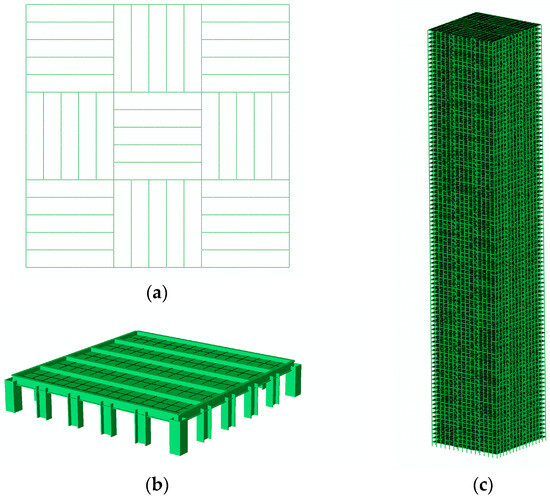 Elastoplastic model of steel bundled-tube: (a) Ground floor plane, (b) Framed tube unit, (c) Overall structure.