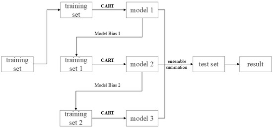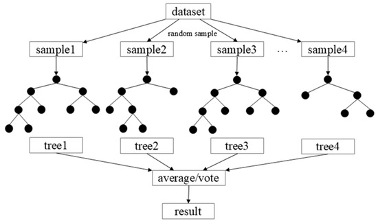 DT begins at the root node and iteratively splits data into subsets based on features, akin to a decision-making process, until each subset is homogeneous or meets a predefined stopping criterion, culminating in a leaf node. RF build on DTs by sampling multiple sub-datasets from the original data to train individual trees, selecting only a subset of features, and combining the outputs through voting or averaging to enhance model stability, as illustrated in Figure 5. The KNN algorithm identifies the nearest K samples in the training data for new data points and classifies them based on majority class judgment, while averaging target values in regression tasks. In multi-classification tasks using SVM with multi-parameter inputs (high-dimensional features), the core principle involves mapping samples in the high-dimensional feature space to a separable space and distinguishing between classes by constructing multiple classification hyperplanes. Utilizing Bayes’ theorem and assuming conditional independence among features, NB algorithm first determines the prior probability of each category. It then computes the conditional probability of features within these categories. By integrating these probabilities, NB calculates the posterior probability for the new data point’s category membership, ultimately selecting the category with the highest probability as the result. Adaboost iteratively trains multiple weak classifiers, initially assigning equal weights to all samples. During training, it directs the focus of weak classifiers towards samples with higher weights, adjusting these weights based on the error rate at the end. The classifiers are then combined to form a strong classifier. XGBoost, grounded in the additive model and gradient boosting framework, optimizes by incrementally adding weak learners, typically CART regression trees. Its primary goal is to build new trees that correct the residuals of preceding models, ultimately combining the predictions from all trees, as illustrated in Figure 6. CatBoost excels in processing categorical features without complex coding. It employs ordered target statistics to utilize category order information directly in modeling and uses symmetric tree structures to minimize prediction bias and enhance accuracy.