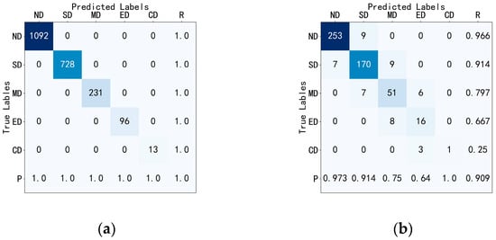 To compare the performance of various machine learning models, confusion matrices were employed for visualization. The horizontal axis represents the actual damage state, while the vertical axis indicates the predicted damage state. Diagonal values represent correctly predicted data points, while off-diagonal values indicate incorrect predictions. Model performance is assessed using accuracy, precision, recall, and F1-score. Accuracy measures the ratio of correct predictions to the total number of samples. Precision is defined as the ratio of true positive predictions to the total predicted positives. Recall measures the ratio of true positive predictions to all actual positives. The F1-score represents the harmonic mean of precision and recall. The formulas for these metrics are as follows (2)–(5).