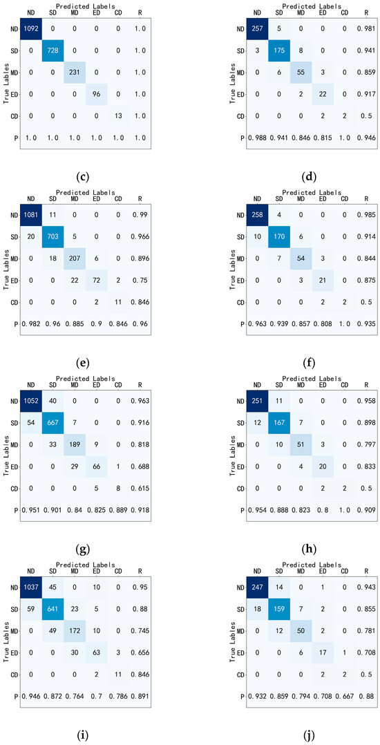 Machine learning confusion matrix: (a) DT training set, (b) DT test set, (c) RF training set, (d) RF test set, (e) KNN training set, (f) KNN test set, (g) SVM training set, (h) SVM test set, (i) NB training set, (j) NB test set, (k) XGBoost training set, (l) XGBoost test set, (m) Adaboost training set, (n) Adaboost test set, (o) CatBoost training set, (p) CatBoost test set.