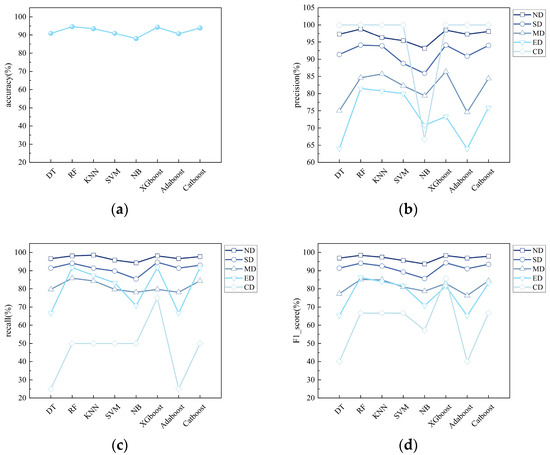 Visualization of machine learning performance metrics: (a) accuracy, (b) precision, (c) recall, (d) F1_score.