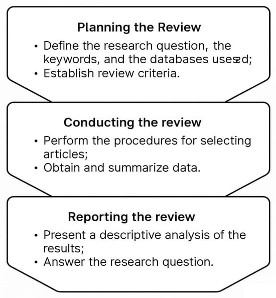 To achieve the objective, a Systematic Literature Review (SLR) was proposed. The process of constructing the SLR must be reproducible by anyone if they use the same criteria and consequently obtain the same results []. Therefore, the SLR provides greater confidence and credibility than a traditional literature review []. The SLR followed a three-stage development process used by Gomes et al. []—(1) planning, (2) conducting and (3) reporting the review—which can be seen in Figure 1.