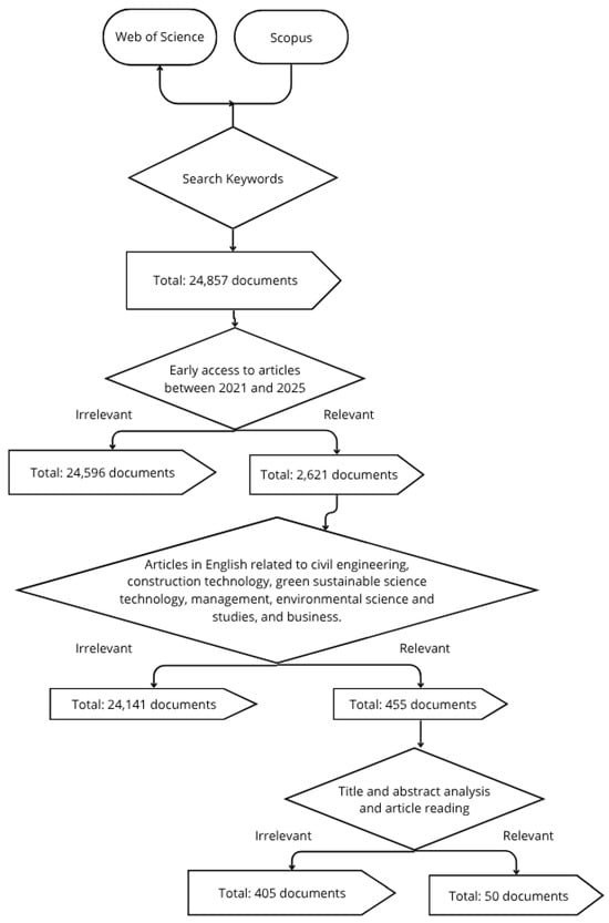 In April 2025, without applying exclusion criteria, a total of 24,857 articles were found in the WOS and Scopus databases. After applying the first criterion (date range) and document type (article), this number was reduced to 2621. The second criterion (categories and languages) resulted in 455 articles. After title and abstract screening, followed by full-article reading, the process concluded with 50 articles in total. According to Liberati et al. [], there is no minimum or maximum number of articles required for an SLR, since during selection, the articles must follow predefined protocols and criteria that guarantee reliability and transparency.