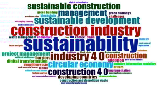 Figure 5, prepared by RStudio Desktop, illustrates a cloud of keywords found in the 50 articles selected from the WOS and Scopus databases. Among the most relevant expressions identified in the topic are sustainability, construction industry, Industry 4.0, circular economy, sustainable development, and Construction 4.0. Other topics are less frequent but still relevant to the scope of the study, including project management, digital transformation, management, sustainable construction, and others.