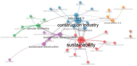 Finally, Figure 6, prepared by RStudio Desktop, shows a network where each node corresponds to a keyword, and each edge represents a link or co-occurrence. The red cluster represents sustainability and construction, where the central term is sustainability and connects to the following terms: construction, green construction, drivers, critical success factors, and debris. The blue cluster represents Industry 4.0 and management, where the central term Industry 4.0 connects to digital technologies, artificial intelligence, digitalization, decision-making, and project management. The purple cluster represents sustainable development and sustainable construction, with the central term “sustainable development” connected to the following terms: economics, environmental economics, and framework. The green cluster has the term “circular economy” as its central node and is associated with blockchain, waste management, and construction and demolition waste. The orange cluster has the central term “construction 4.0” and is related to digital transformation, construction companies, and contextual aspects. Finally, the brown cluster contains only the term “factor analysis”.