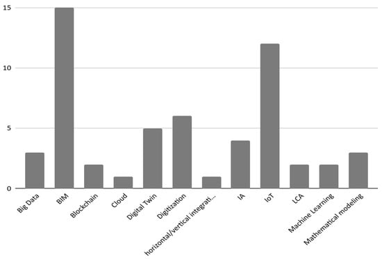 It is worth noting that when Wahlster [] defined the concept of Industry 4.0 (I4.0), sustainability was one of the objectives; however, over time, it has been relegated to the background. Besides the lack of implementation of I4.0 in companies, efforts have focused mainly on enabling concepts and technologies []. Pedota [] reaffirms that the adoption of these I4.0 technologies requires improvement in the skills of the Information and Communication Technologies (ICT) team and also among employees who are not part of ICT. For this reason, the construction sector has greater potential to achieve sustainability goals through technology applied to issues such as resource scarcity and environmental damage. However, what is observed are inconsistencies and gaps in digital infrastructure [,].