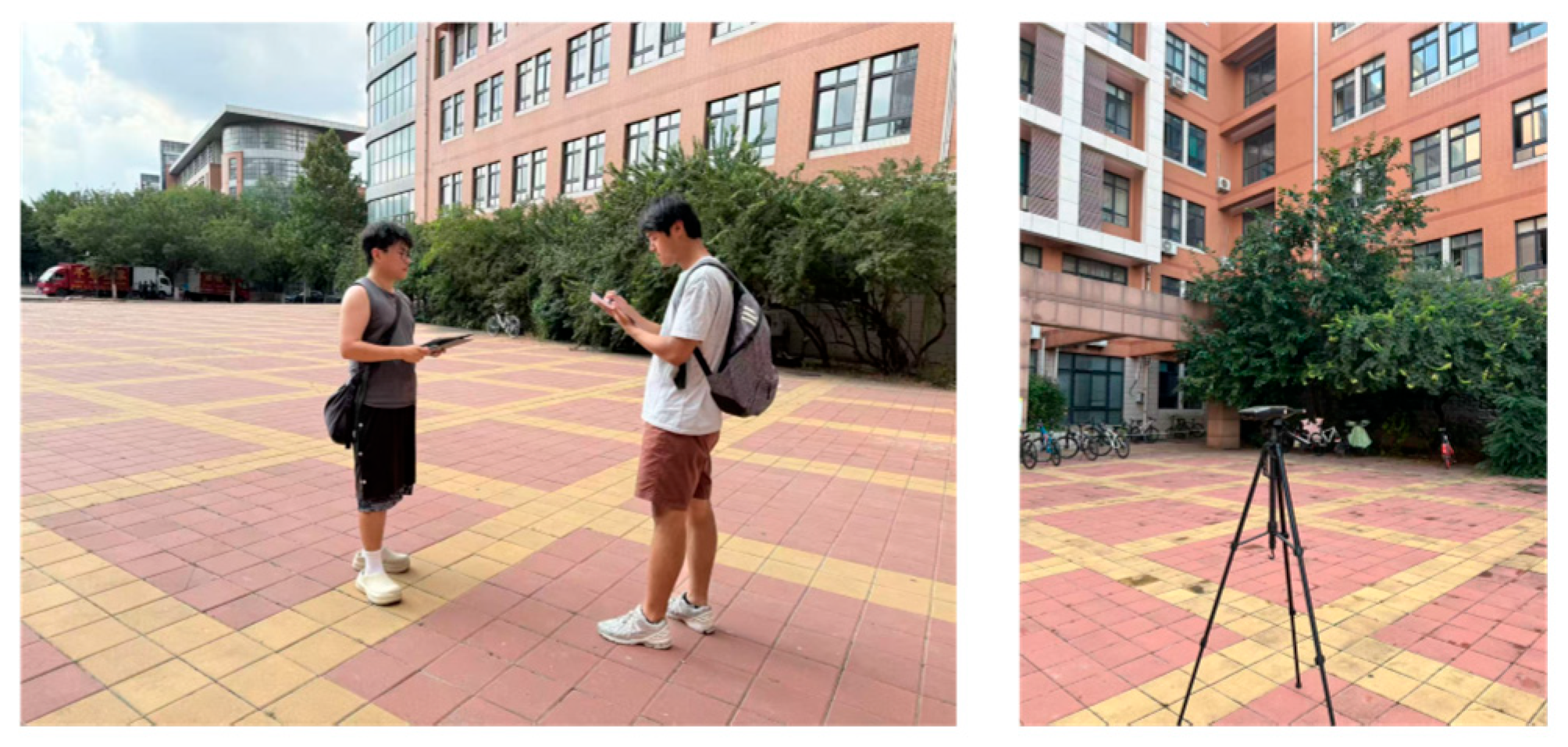 Figure 1. The survey was conducted on weekdays under sunny weather conditions, without rain or strong wind, from 9:00 to 11:00 A.M., under wind speeds below 5 m/s, using both on-site measurements and questionnaire surveys. Photographs of the measurement and questionnaire processes are shown in