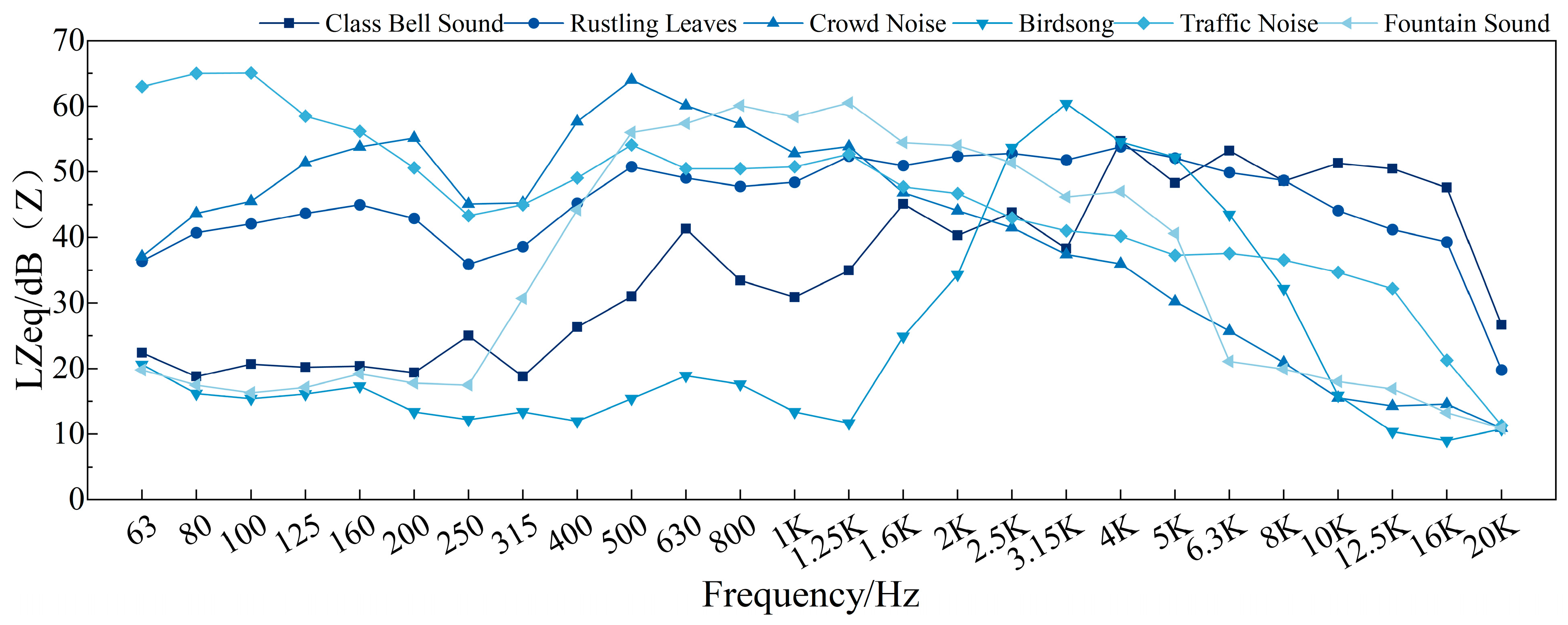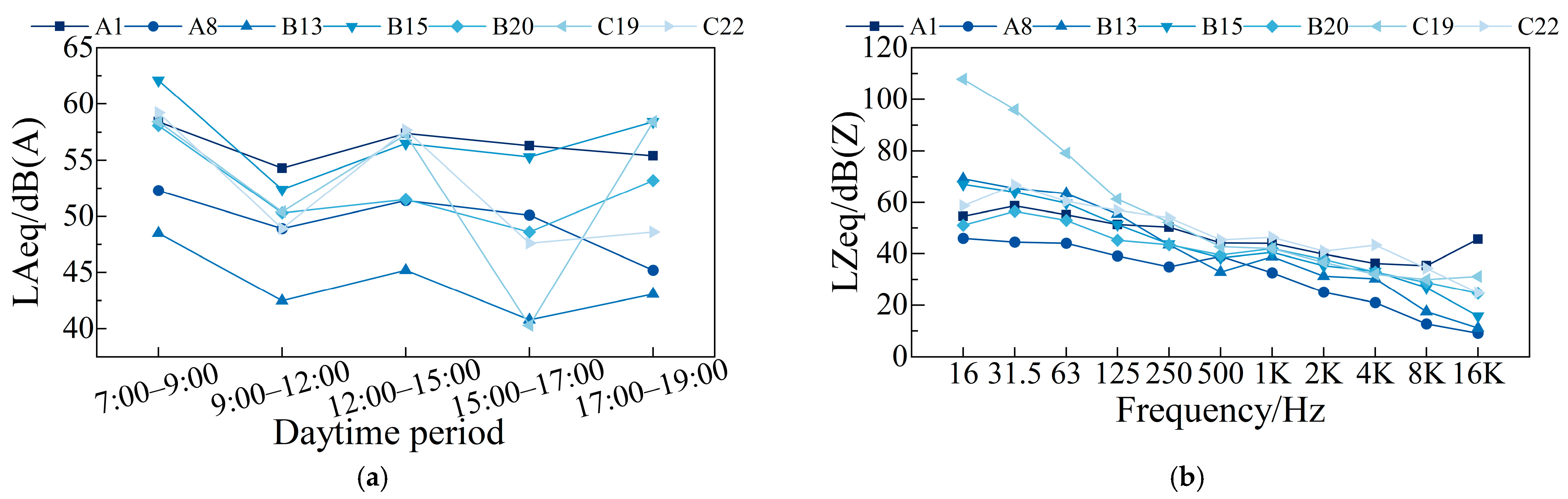 Figure 3). LAeq measurements were conducted from 7:00 to 19:00, thus corresponding to the daily teaching schedule. Within this period, we divided the time into two-hour intervals according to class timetables and selected representative monitoring points based on the results of the preliminary survey. At each measurement point, three repeated measurements were conducted, each lasting three minutes, and the average value was used for the subsequent analysis. Background LAeq levels during class time ranged from 40.8 to 56.2 dB(A), whereas LAeq levels during class breaks with pedestrian activity ranged from 55.4 to 64.5 dB(A). Variations in LAeq levels over time closely corresponded to fluctuations in pedestrian and vehicle traffic, consistent with class schedules and urban traffic patterns. The frequency spectrum of the typical sound environment exhibited a characteristic dominance of low- and mid-frequency components.