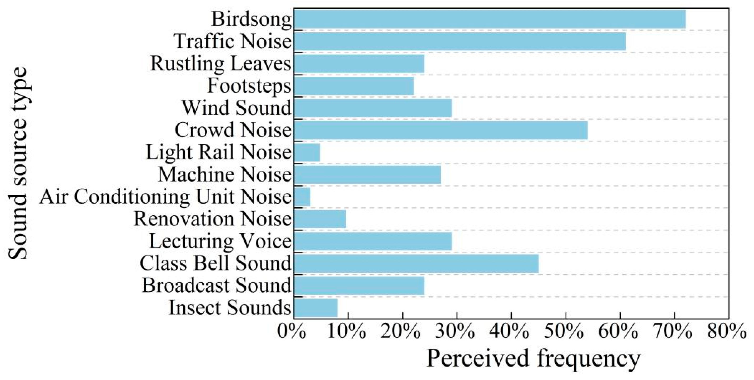 Figure 4). Among these sources, Birdsong was the most frequently perceived, followed by Traffic Noise. The recorded sound sources were categorized as follows: