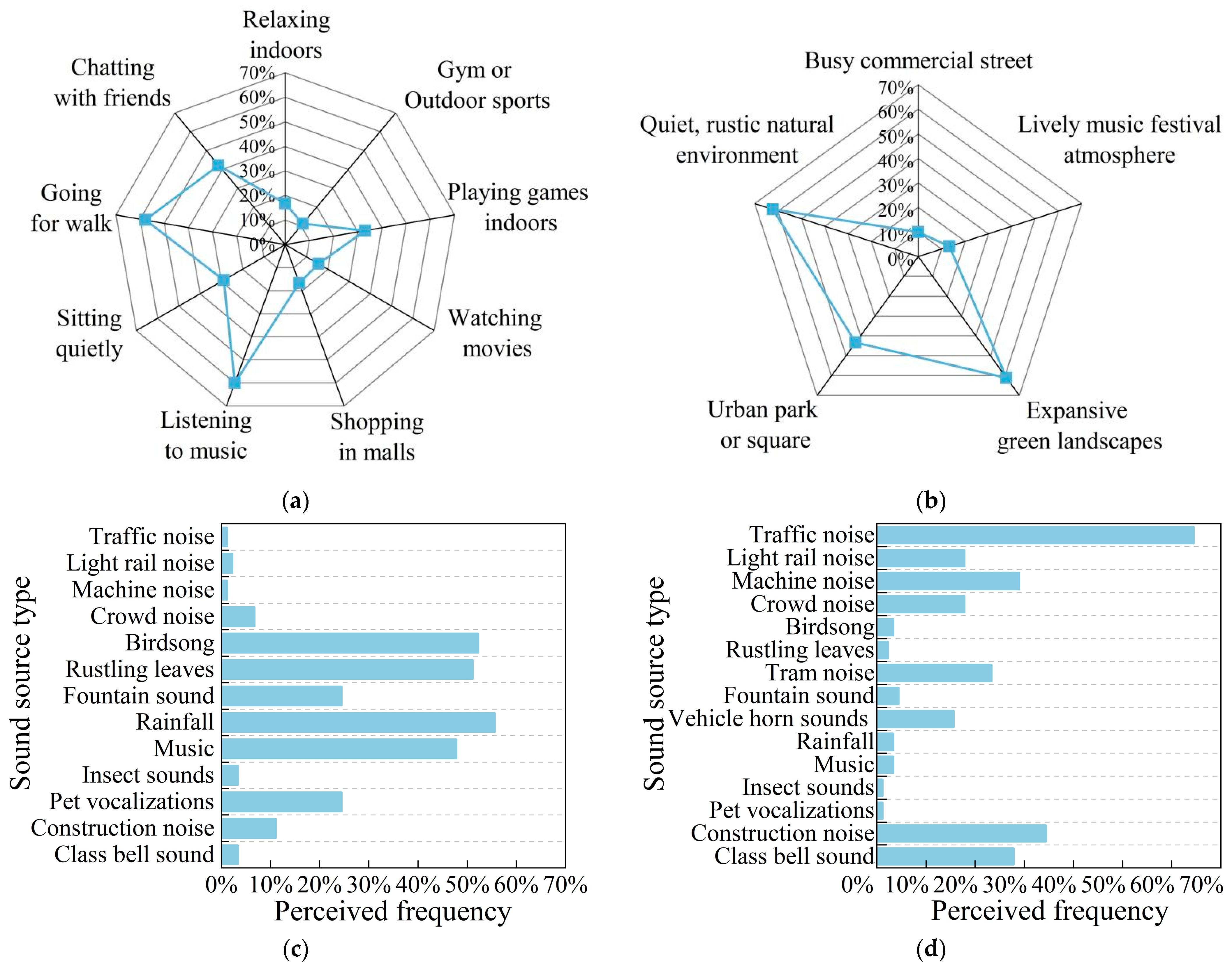 Figure 5) revealed that listening to music was particularly important for relieving stress among college students (61.2%). The highest recognition of restorative value was attributed to quiet, rustic environments (62.2%). Among disruptive sound sources in teaching areas, Traffic Noise ranked the highest (64.4%), followed by construction noise (34.4%) and machinery noise (28.9%). Students expressed a preference for natural sounds such as Rainfall, Birdsong, and Rustling Leaves, and they tended to avoid artificial noises including machinery and Traffic Noise.