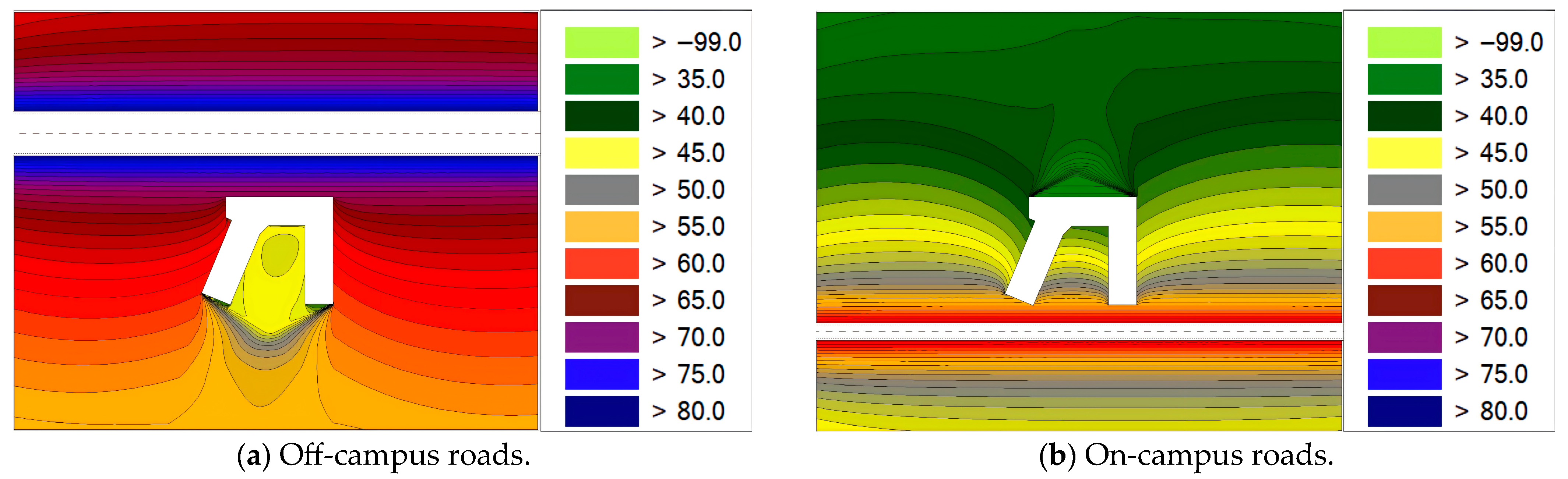 Figure 6, the influence of on-campus traffic on the acoustic environment was relatively minor compared with that of off-campus traffic. Nevertheless, off-campus traffic noise dominated the overall acoustic environment and exerted a pronounced adverse effect on the teaching zones.