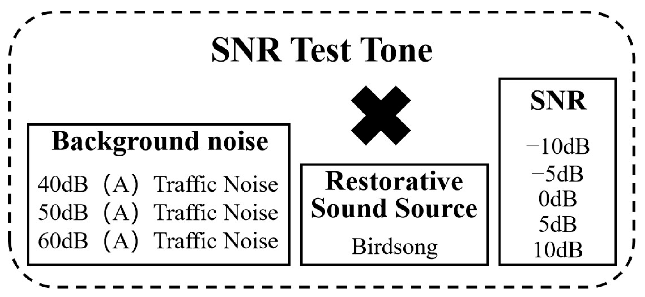 In real-world environments, background noise such as traffic noise can mask other sound sources, thereby influencing the restorative potential of the soundscape. To investigate how the SNR affects soundscape restorativeness, an SNR experiment was conducted. The SNR is defined as the difference in the LAeq between the target signal and the background noise, which reflects the perceptual prominence of the signal within a noisy environment.
