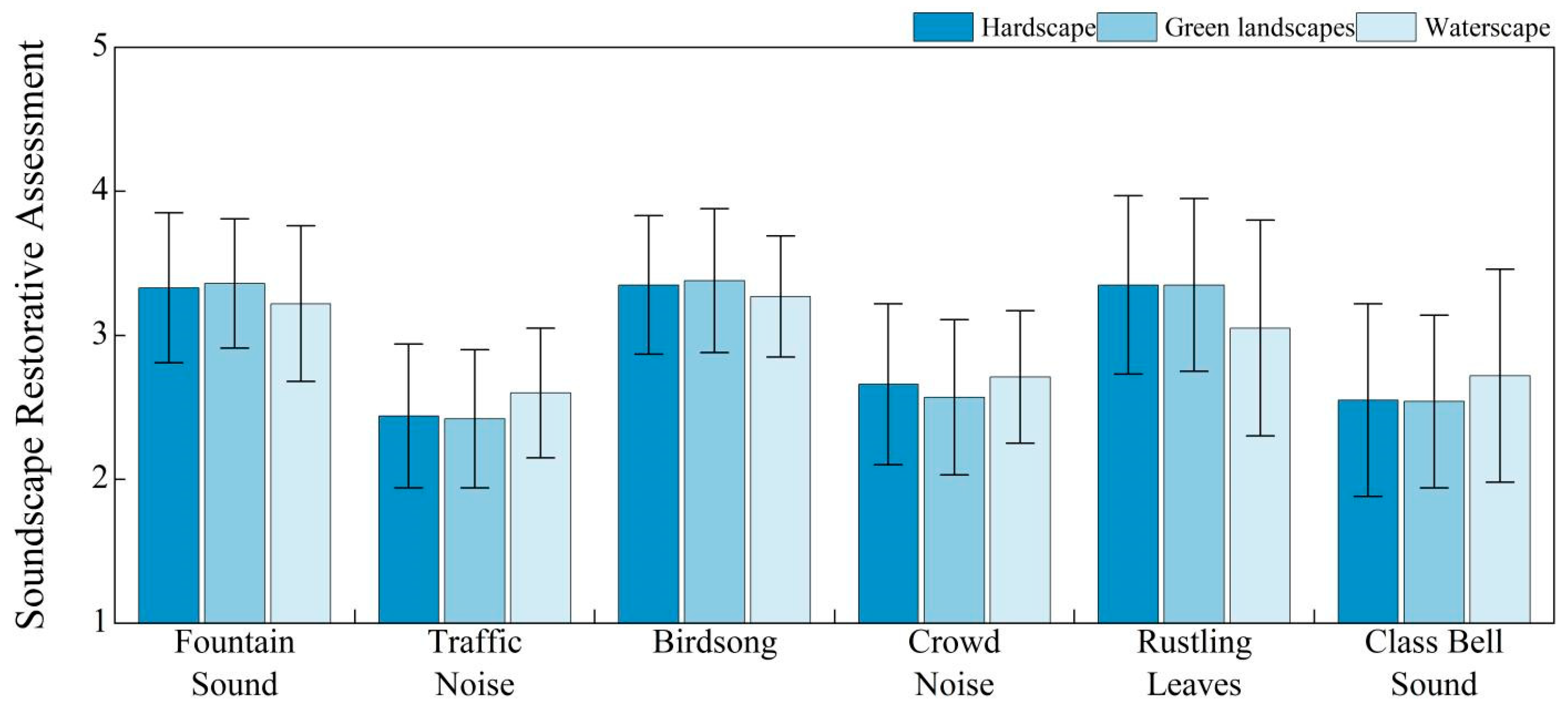 Figure 12). The results showed that restorative ratings for natural sounds—such as Fountain Sound, Birdsong, and Rustling Leaves—were significantly higher in green landscapes and waterscape settings than those in Hardscape environments. Specifically, Fountain Sound achieved the highest soundscape restorativeness score in waterscape settings (3.41), Birdsong scored the highest in green landscapes (3.37), and Rustling Leaves also attained higher soundscape restorativeness in green landscapes and waterscapes than in Hardscape settings. These findings suggest that natural visual elements enhance the restorative potential of the soundscape associated with natural sounds. In contrast, artificial sounds—such as Traffic Noise, Class Bell Sound, and Crowd Noise—scored below 3.00 in all environments but achieved slightly higher soundscape restorativeness in Hardscape settings than in green landscapes or waterscape settings.