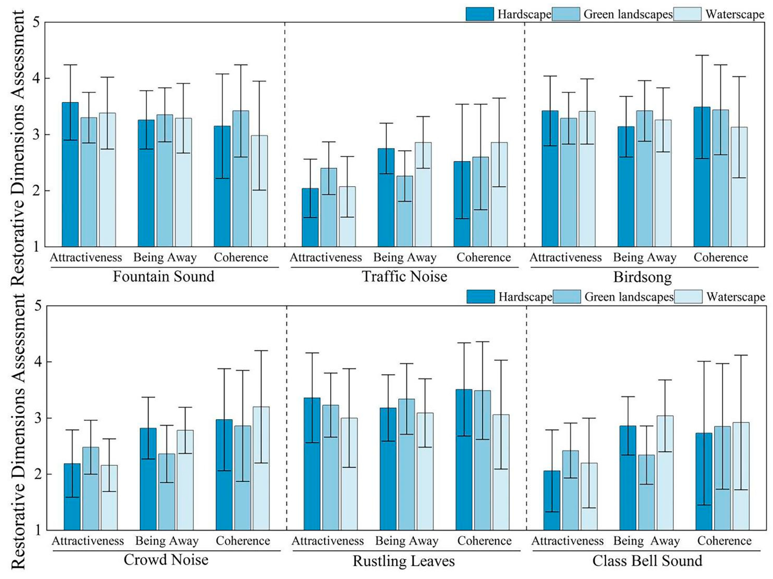 In addition, soundscape restoration is influenced by the visual environment. The naturalness and diversity of visual landscapes can enhance restorative soundscape experiences, and in environments with green landscapes, the coordination of visual and auditory stimuli can enhance overall restorative outcomes [