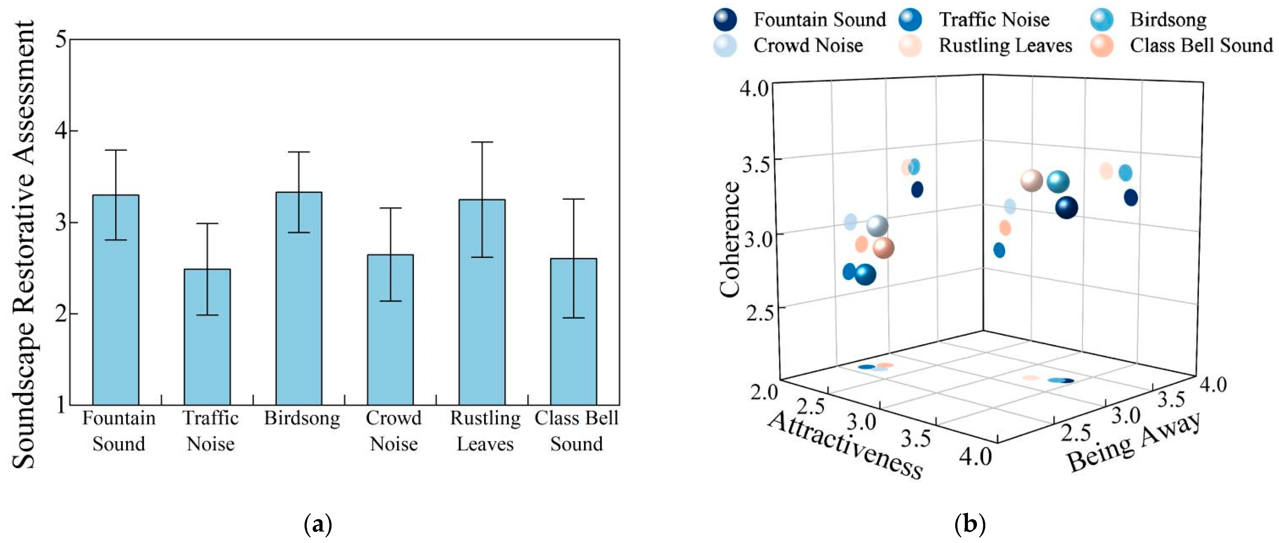 27]. Particularly in learning areas and leisure spaces, high-quality soundscapes can promote students’ psychological restoration [