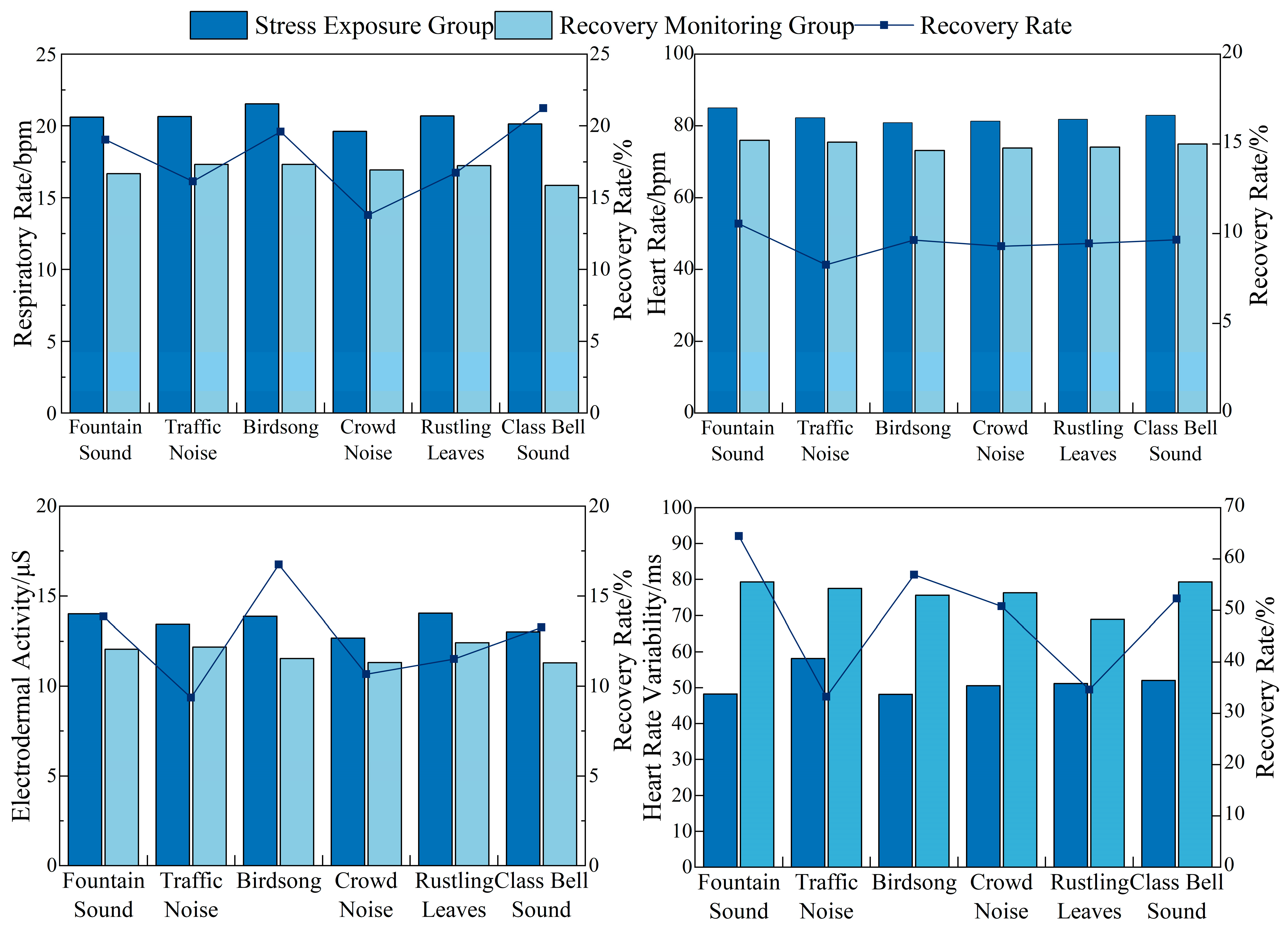 p < 0.01). The class bell sound effectively helps students relax and reduces their breathing rate. Restoration rates ranked as follows: Class Bell Sound (21.23%) > Birdsong (19.61%) > Fountain Sound (19.04%) > Rustling Leaves (16.73%) > Traffic Noise (16.14%) > Crowd Noise (13.80%).