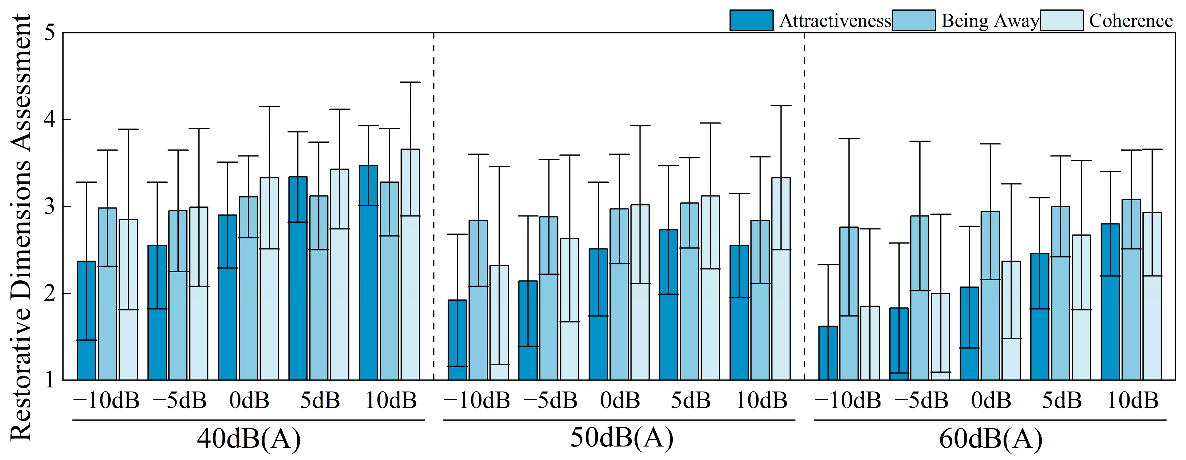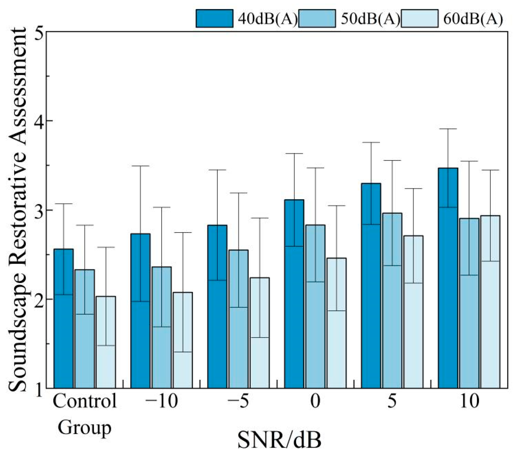 Figure 16, across all three Traffic Noise levels, the addition of Birdsong significantly enhanced restorative ratings, with a general trend of a higher SNR corresponding to stronger restorative effects of the soundscape. Under the 40 dB(A) Traffic Noise condition, an SNR of 10 dB yielded the highest overall soundscape restorativeness score (3.47). Furthermore, at a constant SNR, a higher background Traffic Noise LAeq was associated with lower ratings of soundscape restorativeness.