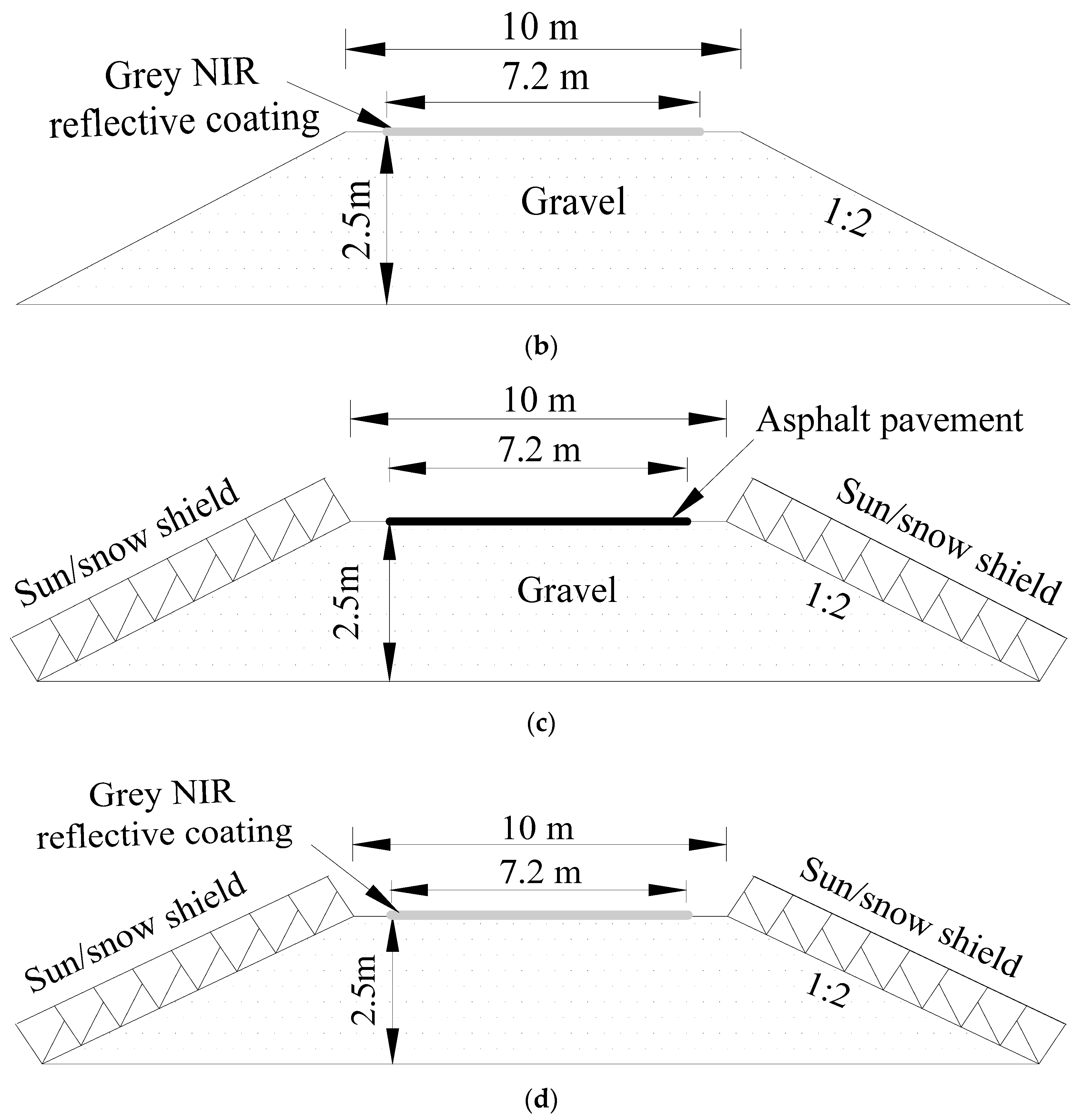 To reduce thermal disturbance by the solar radiation and snow cover, some control measures have been implemented. To reduce solar radiation absorption by asphalt pavements, some scholars proposed a type of asphalt pavement painted by white reflective coating to reduce solar radiation absorption as early as the 1980s and 1990s [