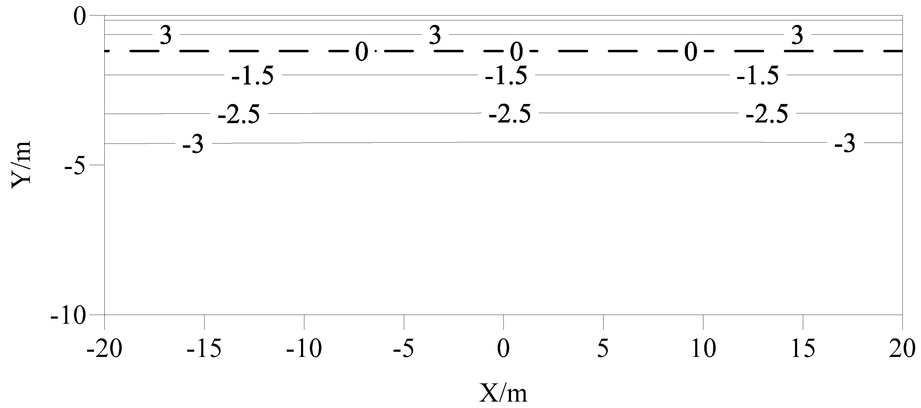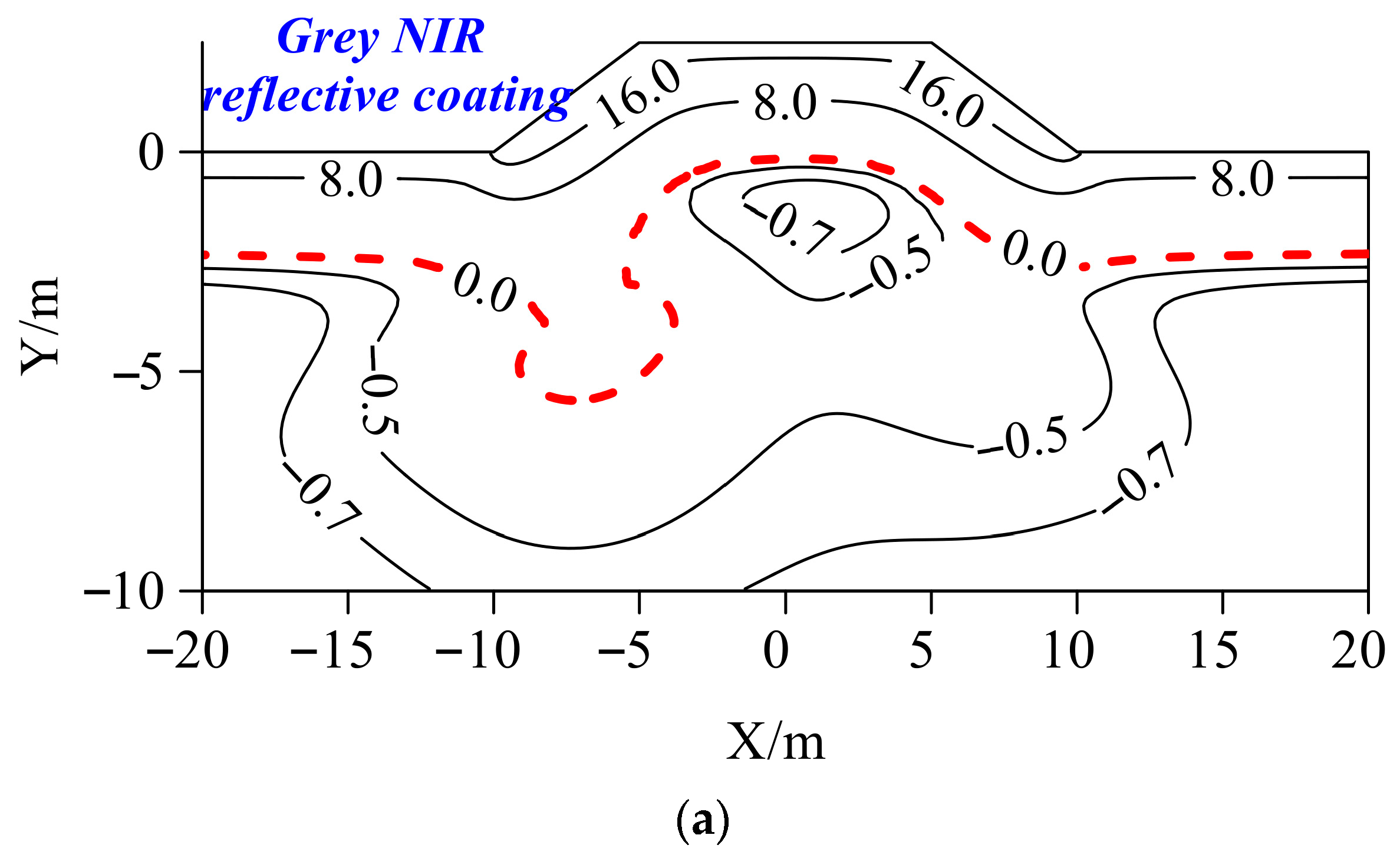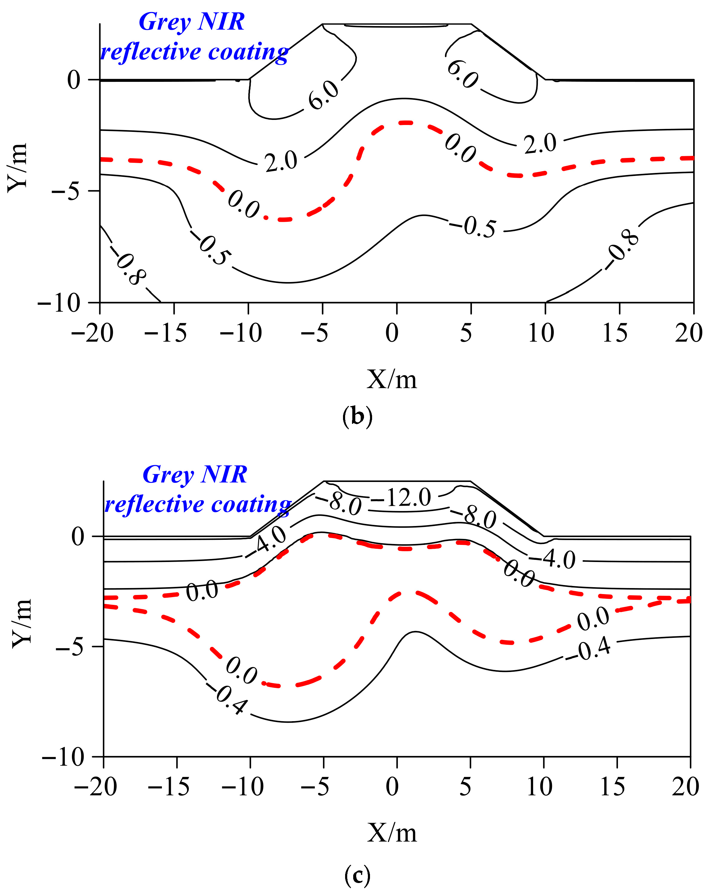 Figure 10 shows the temperature distribution of the grey NIR reflective coating–sun/snow shield embankment in the 25th year after its construction. On 1 July of the 25th year, the 0 °C isotherm under the subgrade had extended into the embankment, with a coordinate of y = 0.45 m. Meanwhile, a −2.5 °C isotherm had appeared under the subgrade with grey NIR reflective coating and sun/snow shield (