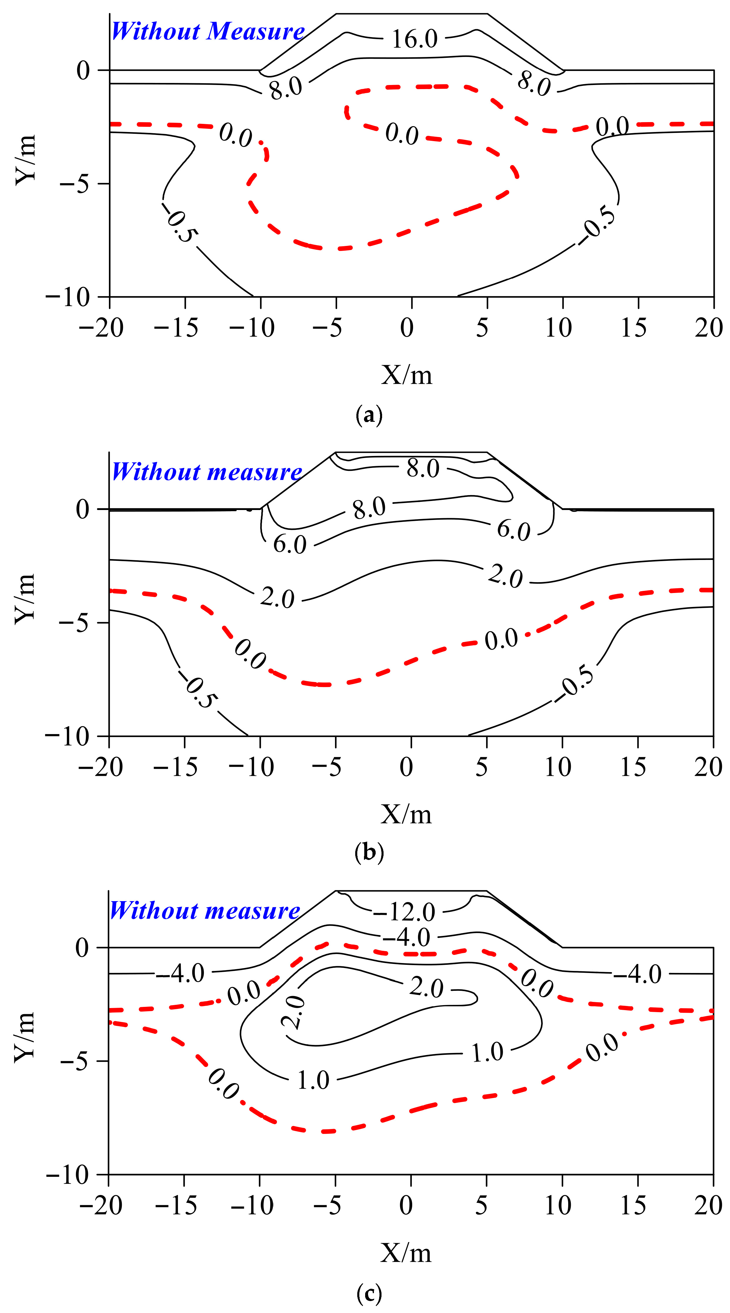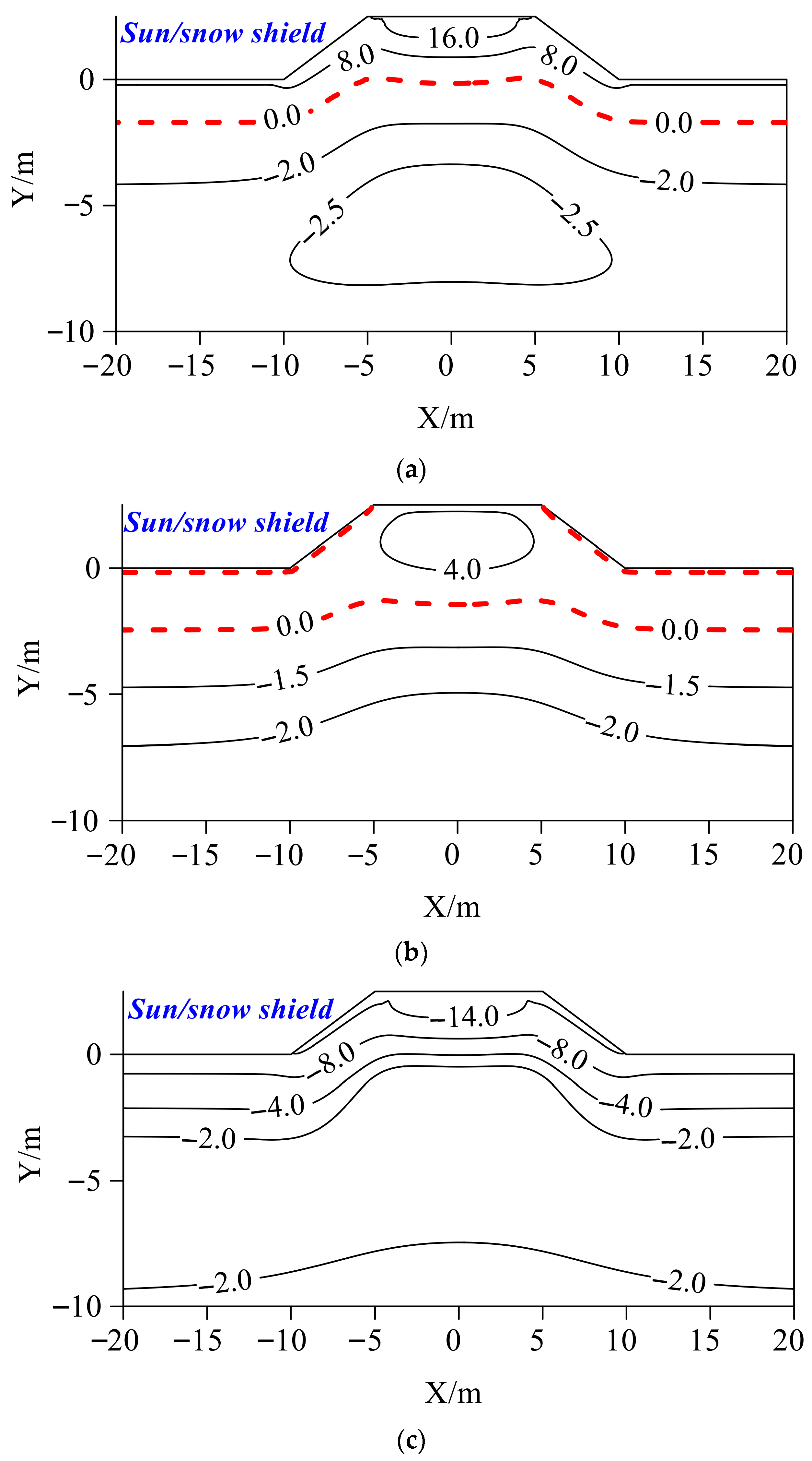 Figure 9 presents the temperature distribution of the sun/snow shield embankment 50 years after its construction. After adopting the sun/snow shield, the temperature distribution on 1 July of the 50th year after the embankment construction is shown in