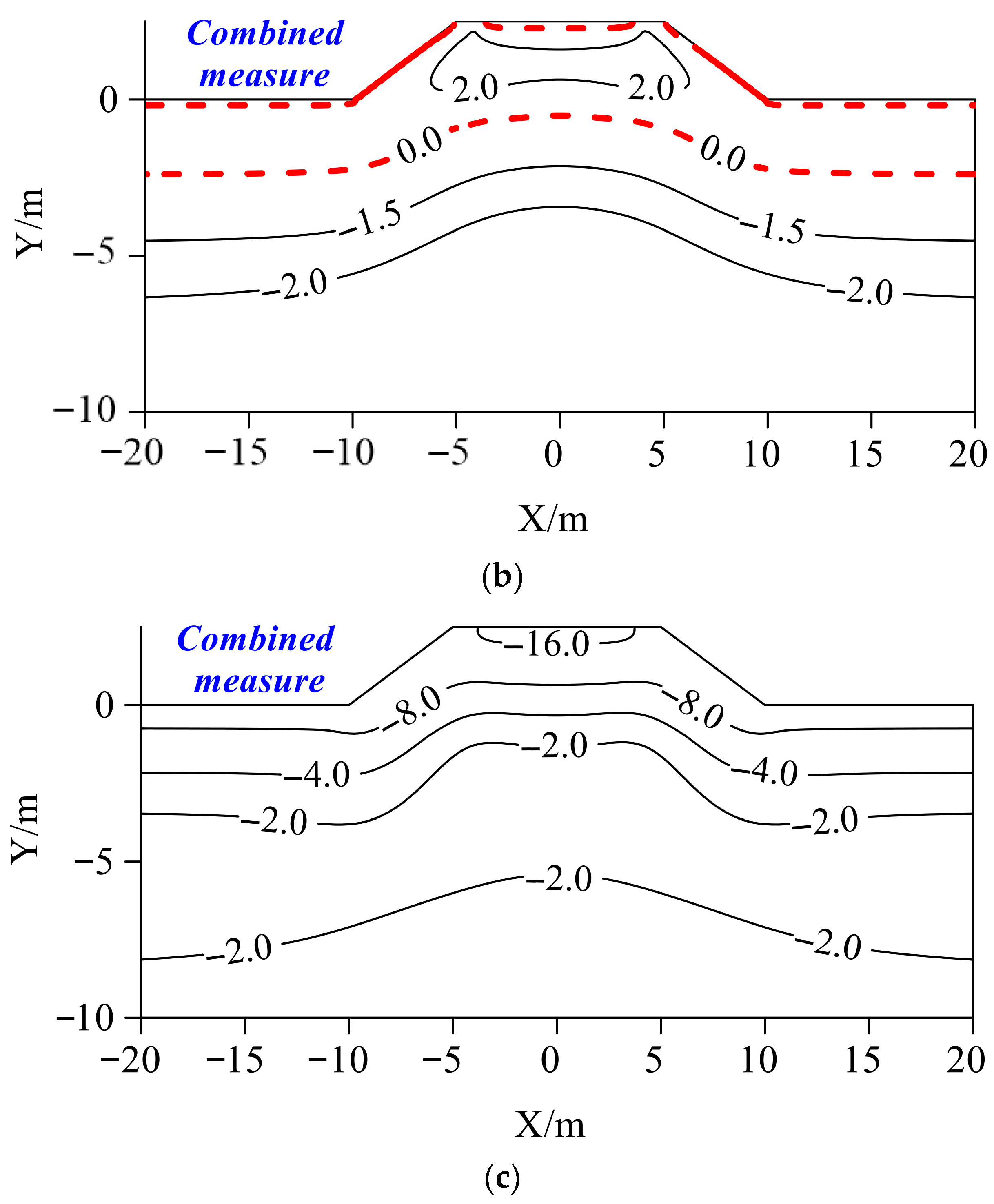 Figure 9c, after adopting the sun/snow shield, the subgrade still cannot be completely refrozen. However, compared with the unprotected subgrade, the temperature under the subgrade with this measure was significantly reduced. The depths of the upper and lower boundaries of the thaw bulb under the sun/snow shield were −0.64 m and −2.47 m, respectively. The region of this thaw bulb was significantly smaller than that of the thaw bulb under the unprotected embankment after 50 years of operation.