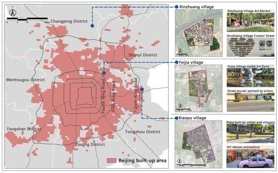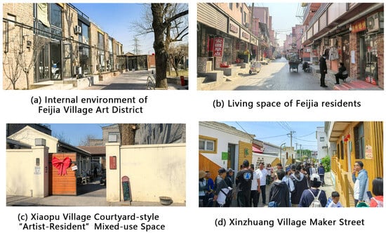 - Xie, F.; Zhou, Y. Research on Spatio-social Evolution of Artists’ Village:Taking Xiaopu Village, in Beijing, as an Example. Urban Dev. Stud. 2023, 30, 31–36. (In Chinese) [Google Scholar]