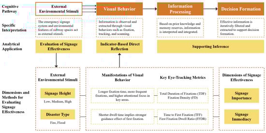 Based on the foregoing, with respect to visual perceptual behavior, humans process external environmental stimuli in three primary steps, following the “visual behavior–information processing–decision formation” cognitive pathway. For example, in the context of evacuation within a metro space, an individual visually observes the emergency evacuation signage system and other environmental features—such as the physical attributes of signage (color, location, content), the positions of elevators or stairways, and the direction of exits—to collect fundamental external information. The brain then combines existing knowledge and experience (e.g., the semantic meaning of signage content) with memory stores (e.g., the layout of the metro space) to interpret the information acquired through visual perception, thereby integrating and evaluating the guidance provided by the signage system. Based on the results of this information processing, the individual forms clear decisions regarding evacuation direction and route selection, which are subsequently translated into actual escape actions.