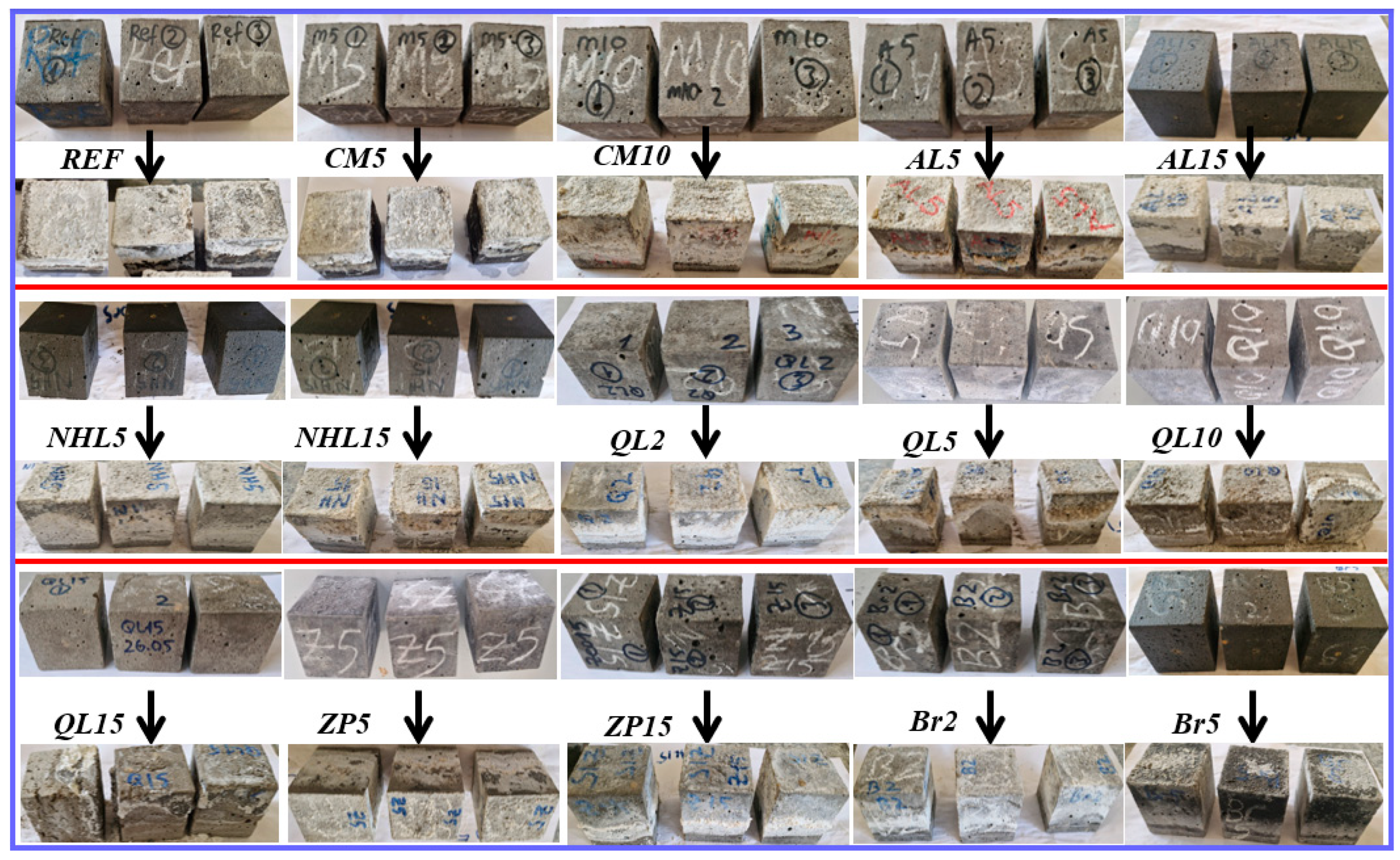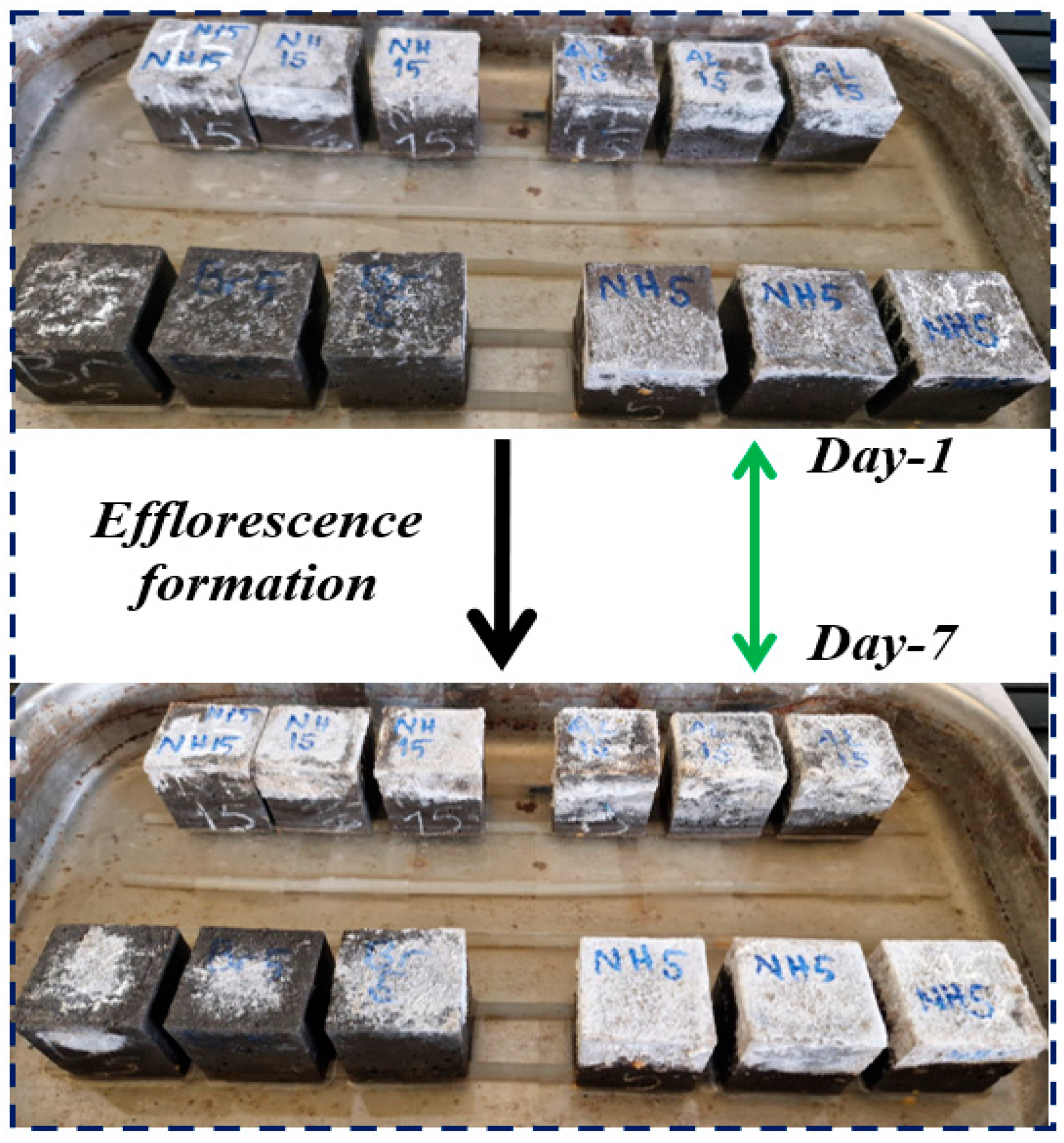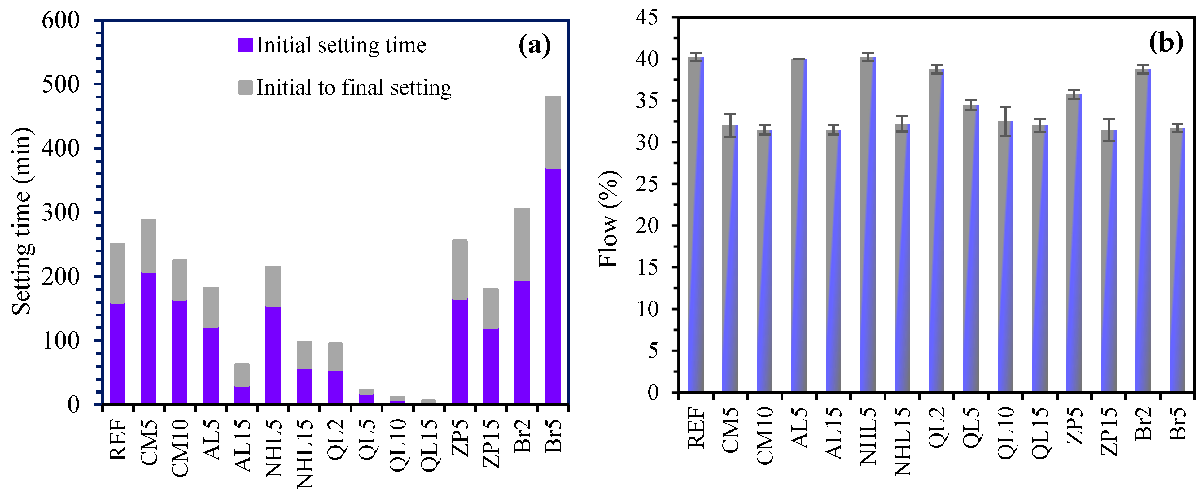 - Overall, the results of this research indicate that the mechanical, physical, and durability characteristics of calcined clay and BFS-based AABs can be enhanced with the use of minor additives even at low ratios. Thus, employing QL, AL, NHL, and CM in suitable proportions generally enhances strength and durability characteristics, whereas ZP and BR effectively mitigate the intensity of efflorescence without compromising strength and physical properties. Nevertheless, it was noticed that the excessive usage of QL or BR led to quick and prolonged setting behaviors, respectively, which restrict their usage in specific civil engineering applications. QL, characterized by its outstanding early strength and quick setting capabilities, is particularly well-suited for applications requiring rapid repair. In contrast, the other minor additives analyzed are appropriate for civil engineering uses, including screed and plastering, owing to their well-balanced setting times and material characteristics. Subsequent investigations may explore the efficacy of calcined clay and BFS-based one-part AABs with QL as repair mortars, and preliminary trials could be carried out for various field applications involving each minor additive.