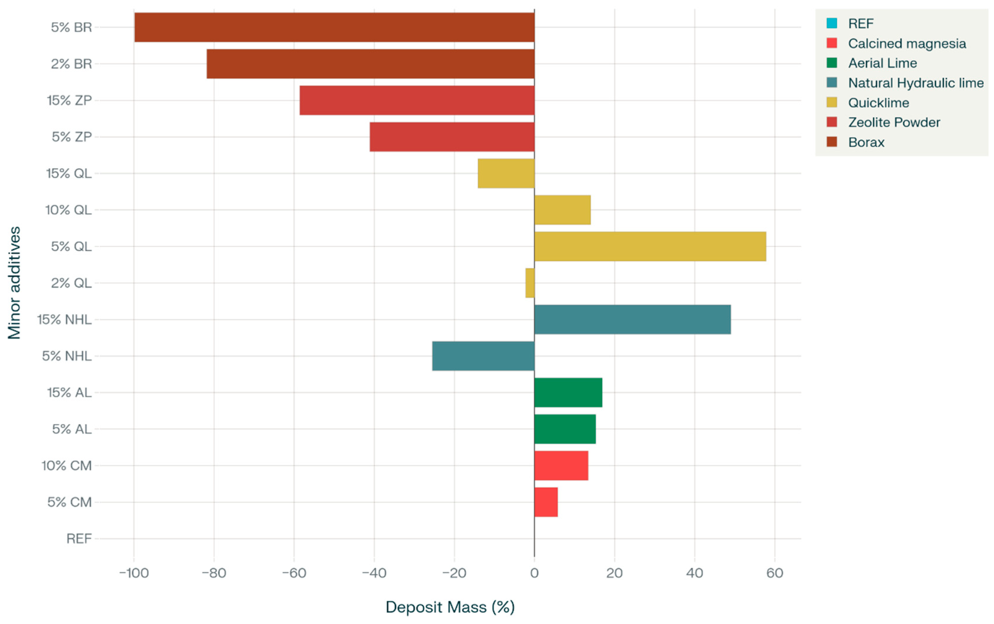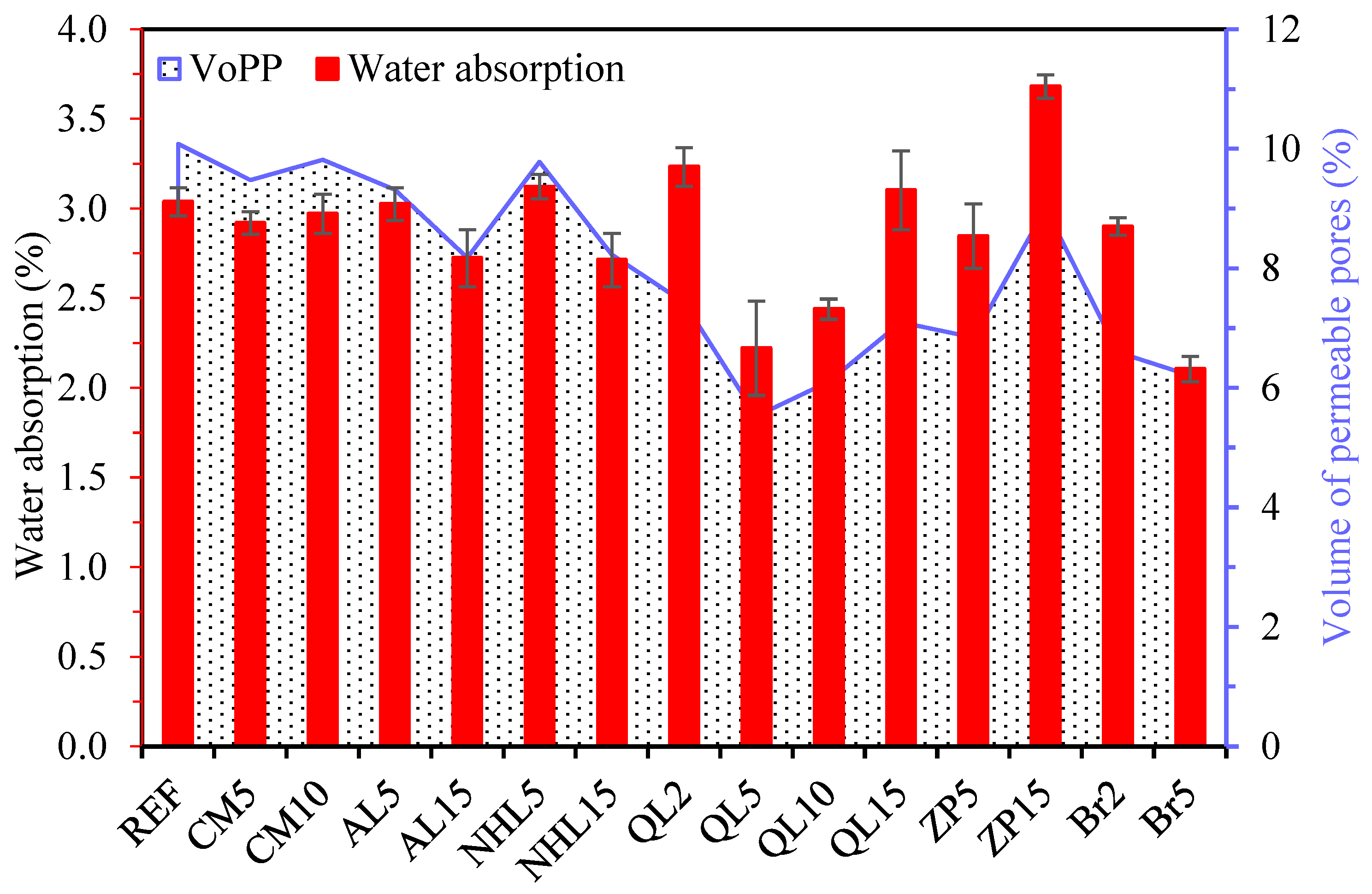 - The incorporation of BR markedly enhanced water absorption and resistance to chloride penetration. The mixtures containing BR, which are capable of limiting sodium ions within their framework, showed efflorescence diminished to almost negligible levels. Similarly, ZP addition reduced the efflorescence formation on mortar surfaces due to its elevated cation exchange capacity;