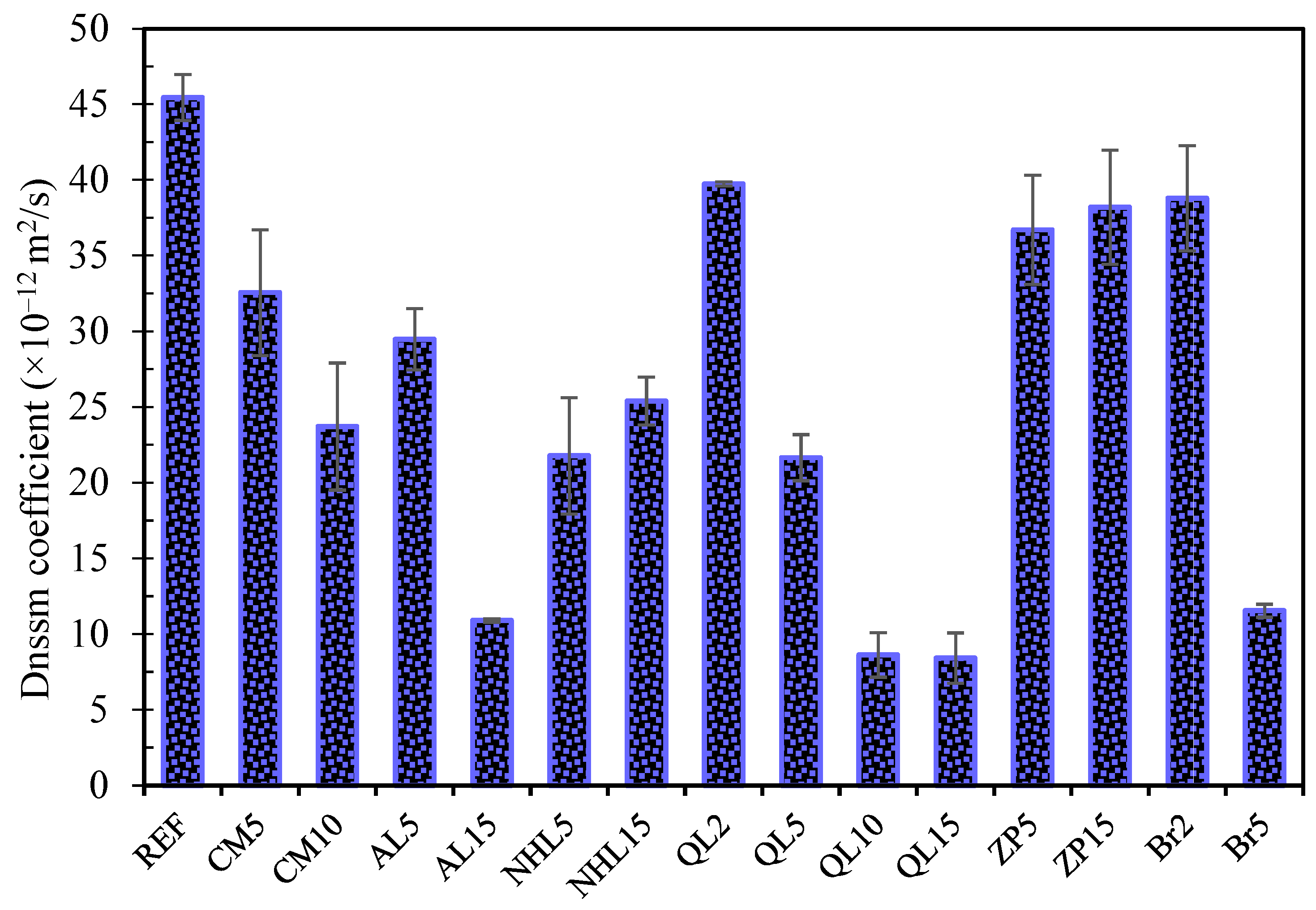 - The test results indicate that the incorporation of QL emerged as the most effective among the minor additives regarding its influence on the characteristics of AAB mixtures. Even at 2% QL addition, the mixtures exhibited a remarkable reduction in setting time and drying shrinkage, achieving decreases of 62% and 47%, respectively. The optimal ratio identified was a 10% addition, which resulted in a 55% increase in strength development, an 82% decrease in the Dnssm coefficient, and a 20% decrease in water absorption. Incorporating over 10% QL resulted in an excessively rapid reaction of the mixture, and the elevated hydration heat subsequently impeded strength development at later ages;