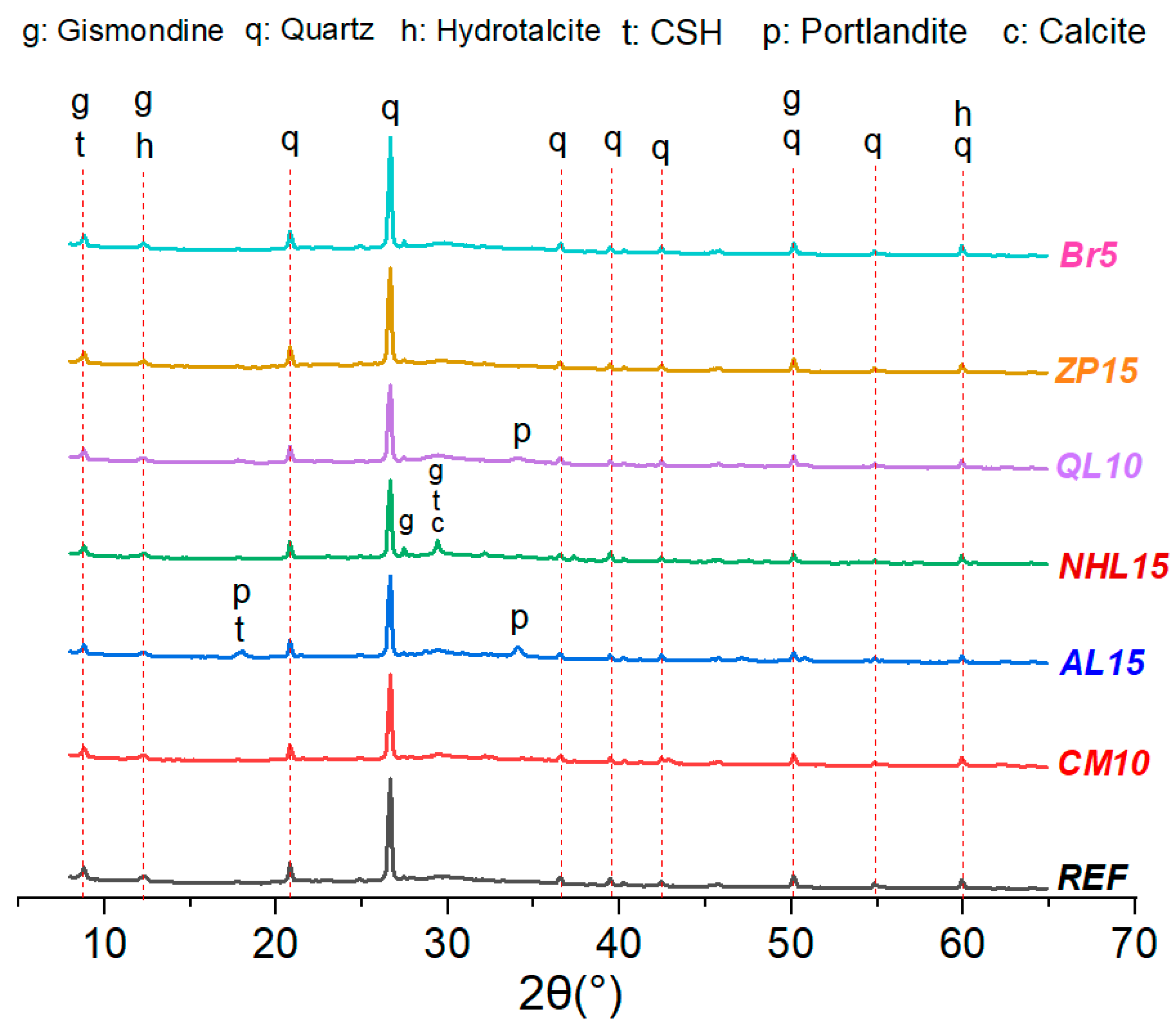 - Cardinaud, G.; Rozière, E.; Martinage, O.; Loukili, A.; Barnes-Davin, L.; Paris, M.; Deneele, D. Calcined clay–Limestone cements: Hydration processes with high and low-grade kaolinite clays. Constr. Build. Mater. 2021, 277, 122271. [Google Scholar] [CrossRef]