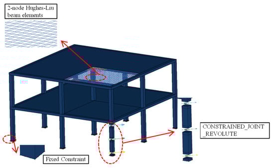 Gravity was applied globally to the model with LOAD_BODY_Y [], whereas the live load was specifically imposed on the slab employing the *LOAD_SEGMENT keyword. As shown in Figure 4, for the column removal device in the finite element model, which consists of two sections of steel columns and three axle pins, the keyword *CONSTRAINED_JOINT_REVOLUTE is used to define the axle pins. To simulate the dynamic scenario of sudden column loss, the column removal is achieved by applying a forced displacement with a very short duration to the axle pins between the two steel columns, thereby instantaneously releasing the support. This approach allows the structure to vibrate freely under the action of gravity, capturing the inertial forces and dynamic amplification effects.