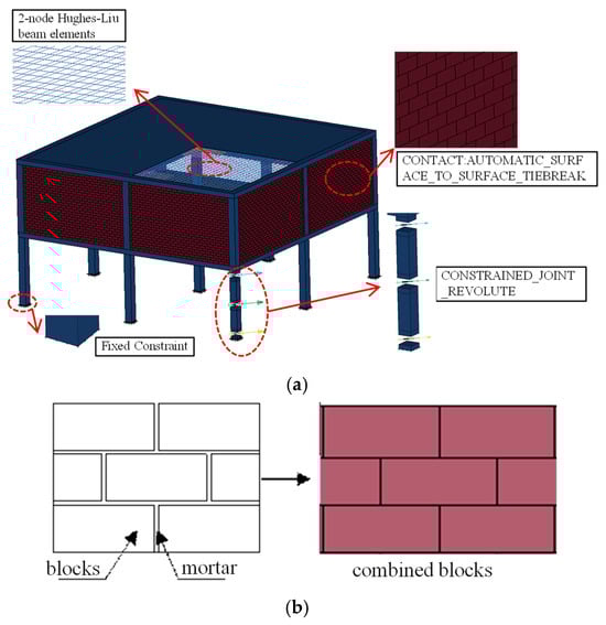 Concrete and infill wall blocks were modelled using an 8-node hexahedral solid element (Solid 164), and reinforcement was modelled using a 2-node Hughes–Liu beam element with a 2 × 2 Gaussian integral. The continuous surface cap model (*MAT_CSCM_CONCRETE) is utilized to simulate the nonlinear behaviour of concrete. This model automatically captures a series of critical nonlinear responses, including compressive hardening, post-peak softening, tensile cracking, confinement effects, and strain-rate effects. Earlier research by Yu et al. [] has demonstrated that the original continuous surface cap model (*MAT_CSCM) can accurately replicate the damage patterns and resistance curves of infill walls. This model serves as the constitutive law for the homogenized ‘combined blocks’ material, capturing its key nonlinear responses. Additional trial computations indicate satisfactory consistency between the simulated and predicted time–displacement curves. Consequently, the simplified modelling approach, which employs this homogenized material model, is adopted in the present study to simulate the behavioural response of the infill wall. The reinforcement materials were characterized using the MAT_PLASTIC_KINEMATIC material model in LS-DYNA, which represents the steel’s stress–strain response with a bilinear elastic–plastic approximation. The embedded constraint method (*CONSTRAINED_BEAM_IN_SOLID) is implemented to simulate the composite action between reinforcing steel and concrete. The material model for the steel columns was defined as a linear elastic material *MAT_ELASTIC.