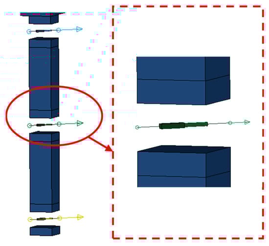 The masonry–mortar interface has a certain strength before failure [], and after failure, the masonry and mortar joints can slide along the interface with each other. To accurately simulate the interaction between masonry and mortar, the keyword *CONTACT_AUTOMATIC_SURFACE_TO_SURFACE_TIEBREAK is used, that is, by defining the contact to reflect the crack development between the block and the block, between the block and the frame, and the sliding of the masonry. In the model, the failure of the masonry–mortar interface is characterized by a criterion based on its normal and shear strength properties (NFLS and SFLS). This criterion is formulated in Equation (1), where failure occurs when the combination of the acting normal stress σn and shear stress σs meets the defined threshold. The contact parameter tensile breaking strength of NFLS was determined to be 1.08 MPa, and shear breaking strength, SFLS, was determined to be 1.5 MPa, according to the research findings of Li et al. [].
