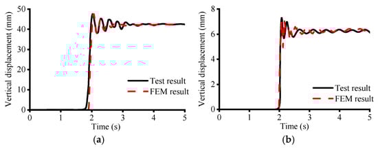 Figure 5a compares the numerical simulation results with the test results for the vertical displacement at the ground floor slab near the removed corner columns of the pure RC frame structure. The maximum displacement obtained from the simulation is 47.5 mm, which is 1.2% lower than the test results; the residual displacement obtained from the simulation is 42.4 mm, which is 0.9% lower than the test results, and it matches the trend of the time–displacement curves. These key parameters, namely the peak and residual vertical displacements, were directly extracted from the dynamic response history of the model. The close agreement demonstrates that the pure RC frame model can accurately simulate the dynamic response of the pure RC frame structure under sudden column removal.