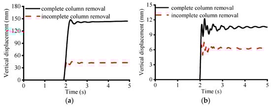In order to investigate the effect of the column removal device on the results, two types of column removal models were established. One is defined as an incomplete column removal device, as shown in Figure 4; the other is defined as a complete column removal device by completely removing the corner columns using the keyword * MAT_ADD_EROSION. Figure 7 shows the time–displacement curves of the pure RC frame structure, and the infill wall RC frame structure with different column removal devices, respectively.