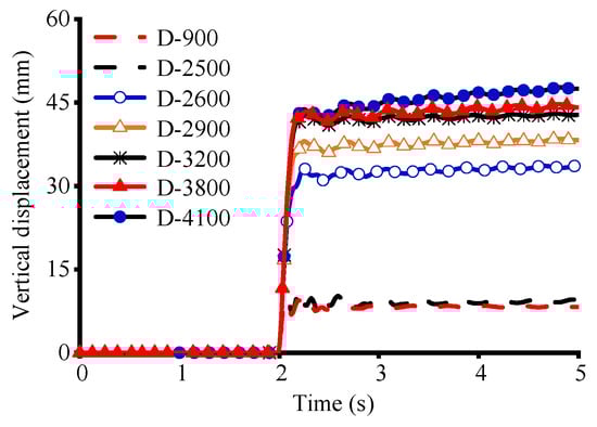 The time–displacement curves near the structural corner columns at different doorway locations are shown in Figure 9. With the increase in the value of L, the displacement near the structural corner column increases gradually. The displacement near the structural corner column increases by 19% when the door that is opening is 2500 mm away from the failure column compared with 900 mm away from the failure column, the structural vibration period increases by 0.9%, and the stiffness decreases by 18.1%; the displacement near the structural corner column increases by 296% when the distance is increased to 2600 mm, the structural vibration period increases by 9.3%, and the stiffness decreases by 71.5%; when the distance is increased to 3800 mm, the structural vibration period decreases by 9.3%, and the stiffness decreases by 71.5%; when the distance is increased to 3800 mm, the displacement near the structural corner column increases by 360%, the structural vibration period increases by 10.6%, and the stiffness decreases by 78.2%; and when the distance is increased to 4100 mm, the displacement near the structural corner column reaches the maximum value and increases gradually with the increase in time, and the time–displacement curve begins to not converge.