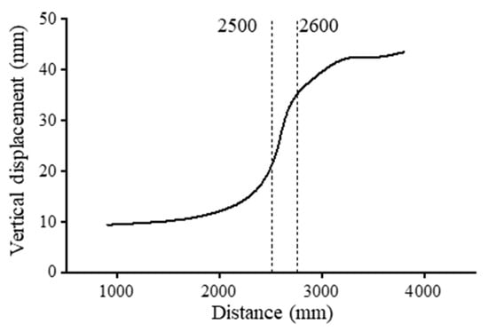 Figure 10 shows the curve of structural displacement versus the position of the open doorway, taking the distance from the centre of the doorway to the failure column as the horizontal coordinate, and taking the maximum displacement of the structure after removing the column as the vertical coordinate. It can be seen that the displacement near the corner columns of the structure increases with the increase in distance, and the rate of change in the displacement value near the corner columns of the structure is larger when 2500 < L < 2600.