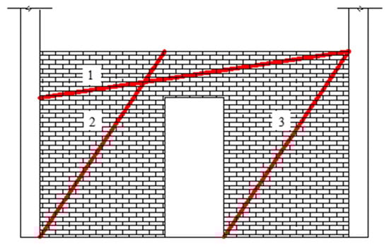 Figure 15 shows that, for example, when the opening rate is 13.7% in the structure, the infill wall can be equated to three and four compression rods to transfer the load when one and two windows are opened [], and the width of the wall affects the effective area of the compression rods, which in turn affects the stiffness of the compression rods. For the same opening rate but different numbers of window openings, strut 1 remains the same, and the number of openings affects the strength of the remaining struts. The specimen after the failure of the corner column is equivalent to a cantilever member subjected to a uniform load, and the area near its fixed end (strut 2) is subjected to a larger bending moment and shear force, which plays a controlling role in the structural load-carrying capacity. When two window openings are opened, the effective area of strut 2 is reduced, and the structural load-carrying capacity is weakened, while the other struts located at the cantilever end need to withstand a much lower imposed load than strut 2, and thus strut 3 and strut 4 have a limited contribution to the structural load-carrying capacity; thus, the weakening or increasing of the effective area of strut 2 has a more sensitive effect on the structural stiffness. Since increasing the number of openings is stronger than increasing the rate of the openings for the weakening of the effective area of strut 2, the increase in the number of openings has a more significant effect on the structural stiffness than the increase in the rate of the openings.
