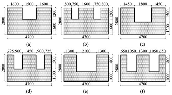 Finite element model of infill wall openings: (a) W-13.7%-1; (b) W-13.7%-2; (c) W-20.5%-1; (d) W-20.5%-2; (e) W-28.7%-1; and (f) W-28.7%-2.