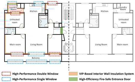 Although the subject unit complied with the Energy-Saving Design Standards for Buildings [] at the time of construction in 1993, substantial performance gaps exist when compared to current standards. Figure 1 presents three principal envelope improvement strategies implemented to address these performance disparities. Systematic enhancement of envelope performance was achieved through the installation of high-performance window systems, replacement of entrance doors with doors featuring both enhanced thermal performance and fire safety specifications, and application of interior insulation systems utilizing vacuum insulation panels.
