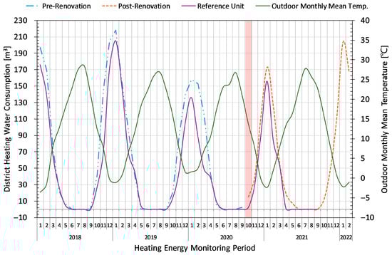 Comparison of monthly heating water consumption for the renovated unit (pre- and post-renovation) and the reference unit alongside outdoor mean temperature.