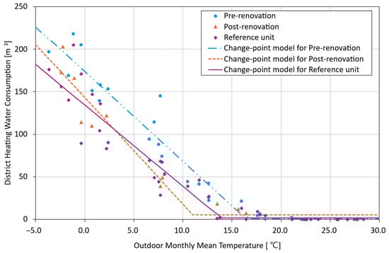 To quantify the effects of building envelope renovation on changes in heating initiation timing, change-point model analysis was performed on heating water consumption for the renovated unit before and after renovation, as well as for the reference unit. The analysis utilized monthly billing-based heating water consumption and outdoor temperature data.