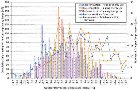 Cumulative daily heating water consumption by outdoor temperature intervals in pre- and post-renovation periods.