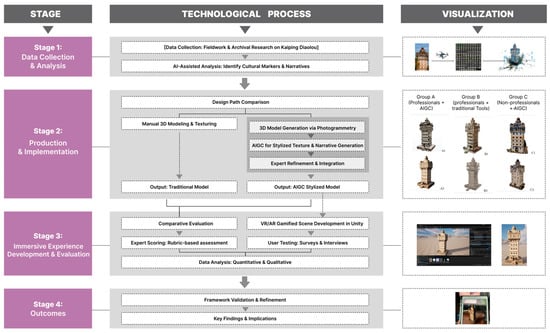 The aim of this research is to directly address this long-standing research issue that has not been resolved before. It involves developing and evaluating a new type of human–AI collaboration framework, exploring a new path for the stylized, immersive, and interactive revitalization of architectural cultural heritage. Using the Kaiping Diaolou and surrounding villages in Guangdong Province, China—this UNESCO World Heritage site with a rich but fragmented history—as the case study, this research pioneers a new method for digital preservation. The main goal is to establish a workflow that utilizes AIGC for artistic style generation, while relying on human expertise for cultural and historical validation.