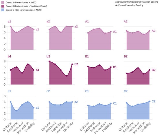 Analysis of the Evaluation Results of Modeling Outcomes by Design Participants and the Expert Panel. The subgraphs (a1–A2; b1–B2; c1–C2) represent professional designers using the AIGC mixed workflow, professional designers using traditional tools, and non-professional users using AIGC tools, respectively.